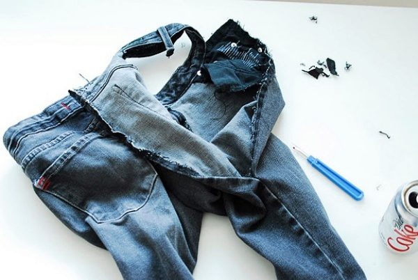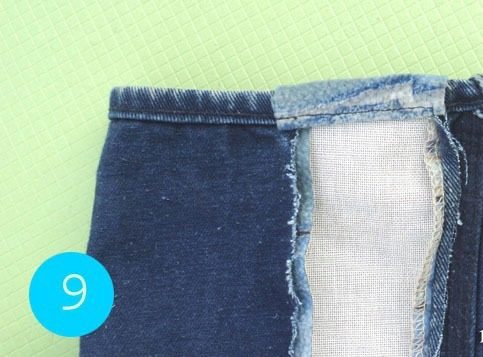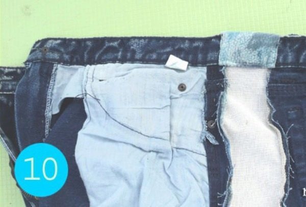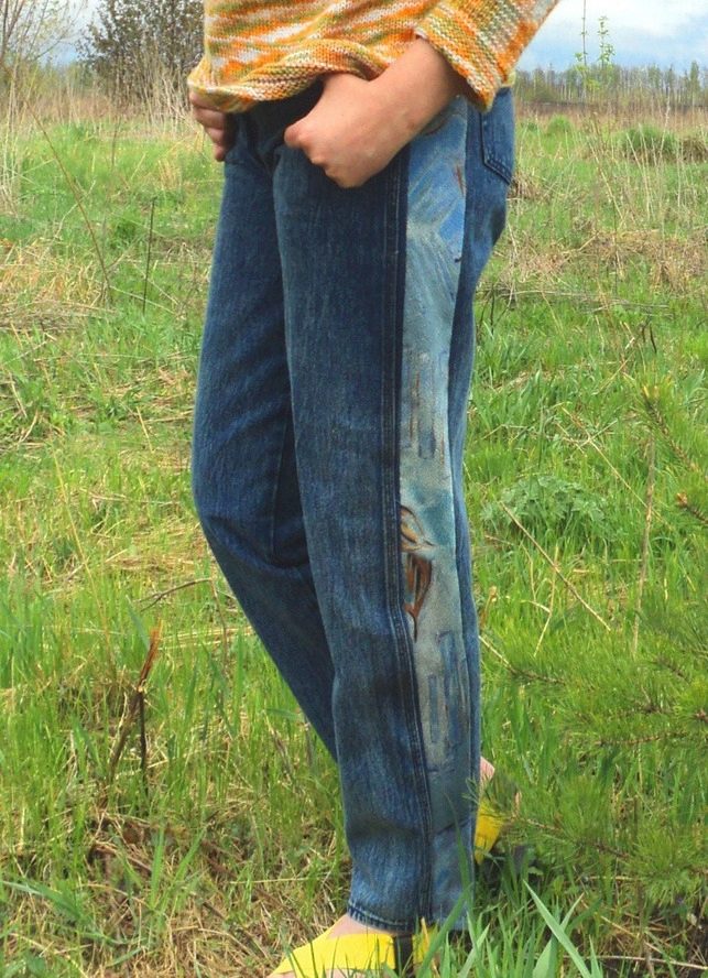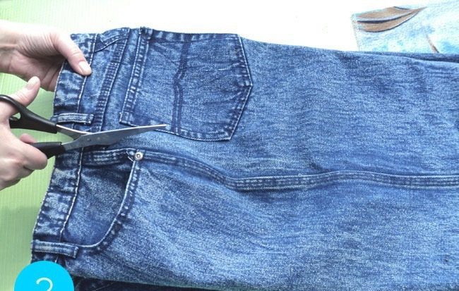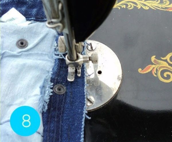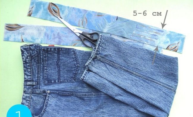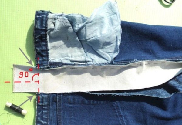 Then divide the resulting number by two and add 2 cm to the stock. Now you should cut two flat fabrics of the desired length and width and sew them into the previously sewn side seams of jeans.