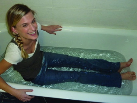 Before you begin to stretch, it is recommended to wet your pants. In order to give the fabric a better manipulation, you can rinse jeans in warm water with an air conditioner - it will soften the material and make it more elastic. After that, the pants must be pressed, but not very much.