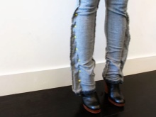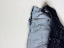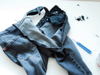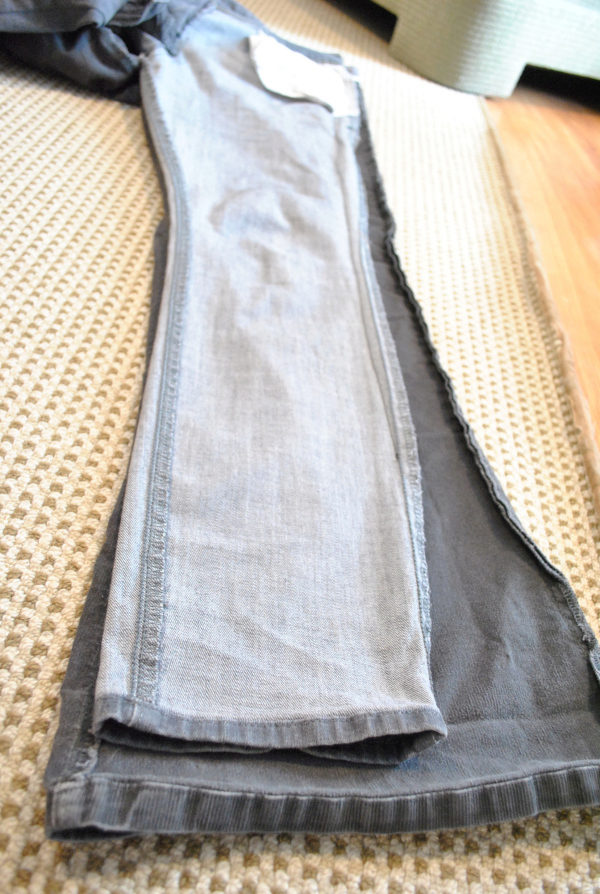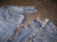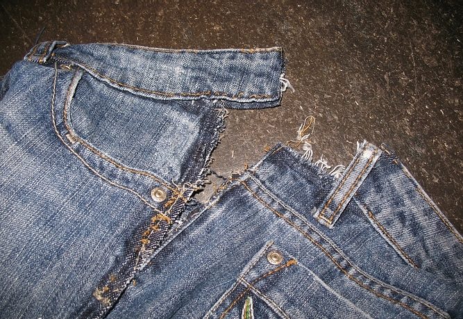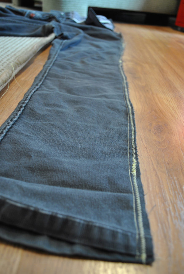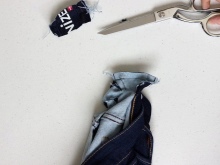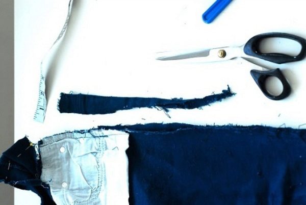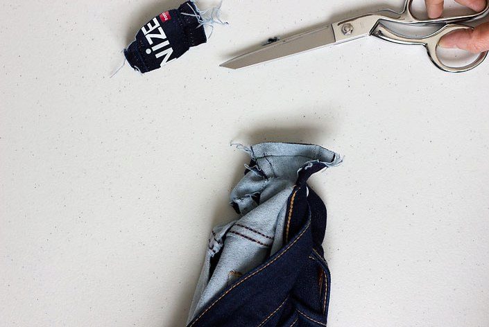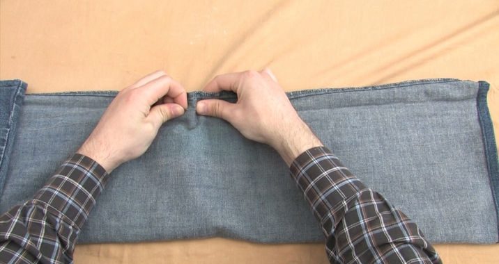 - Jeans must be removed, spread out on a horizontal surface and cut down from the knee downwards.