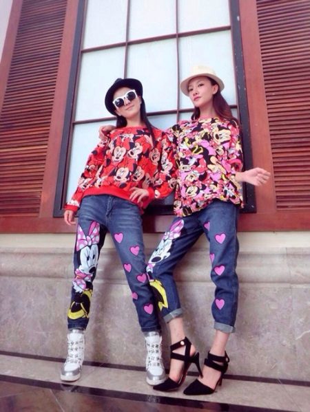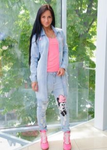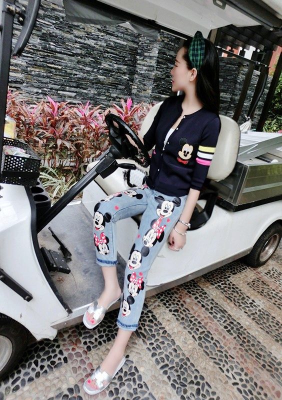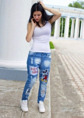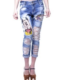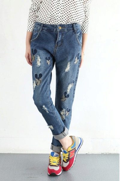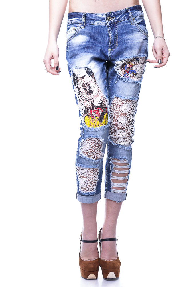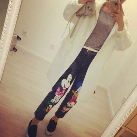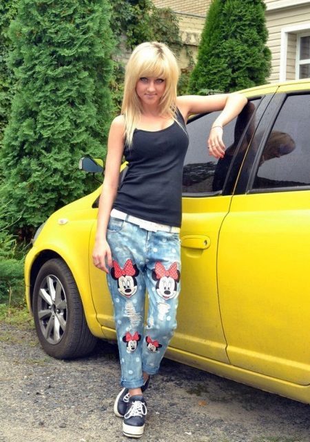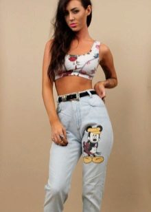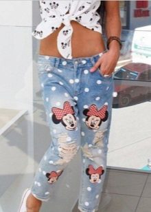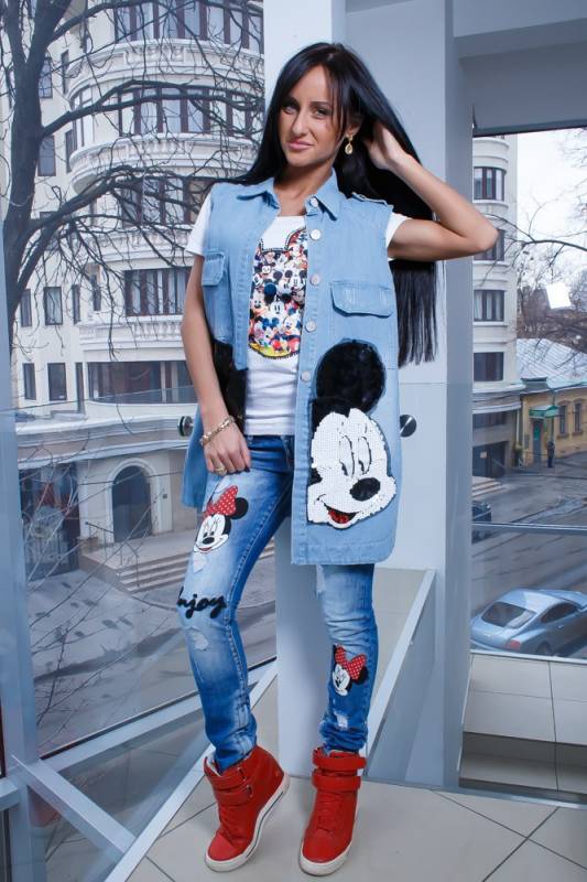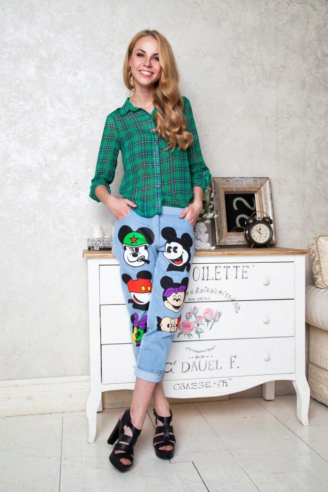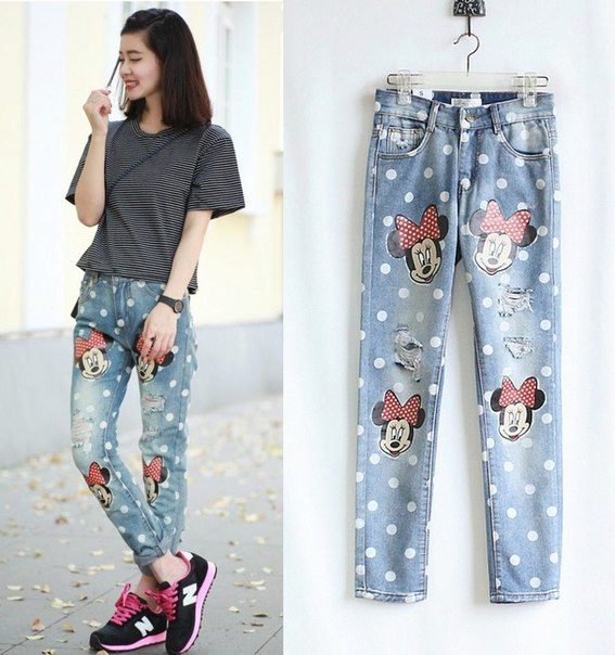 Mickey Mouse jeans are used as an element of casual wear, you can go for a walk, to the cinema, to a party, etc.