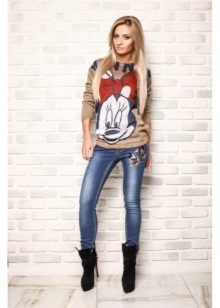 The classic combination: jeans + black top or jumper + sandals, sandals or sneakers. A strict image will dilute the bright, large image of a cheerful little mouse on one or both of the legs.