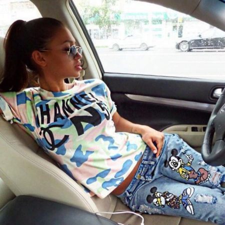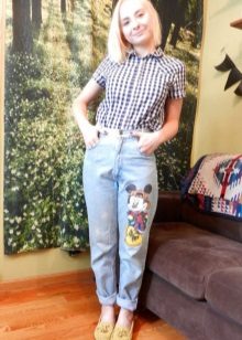 Original look jeans with Disney print in combination with a shirt or top in a cage. The shirt can be worn tucked, knocked off, tied in a knot on the chest, etc. In any case, it turns out very elegant and bright set.