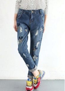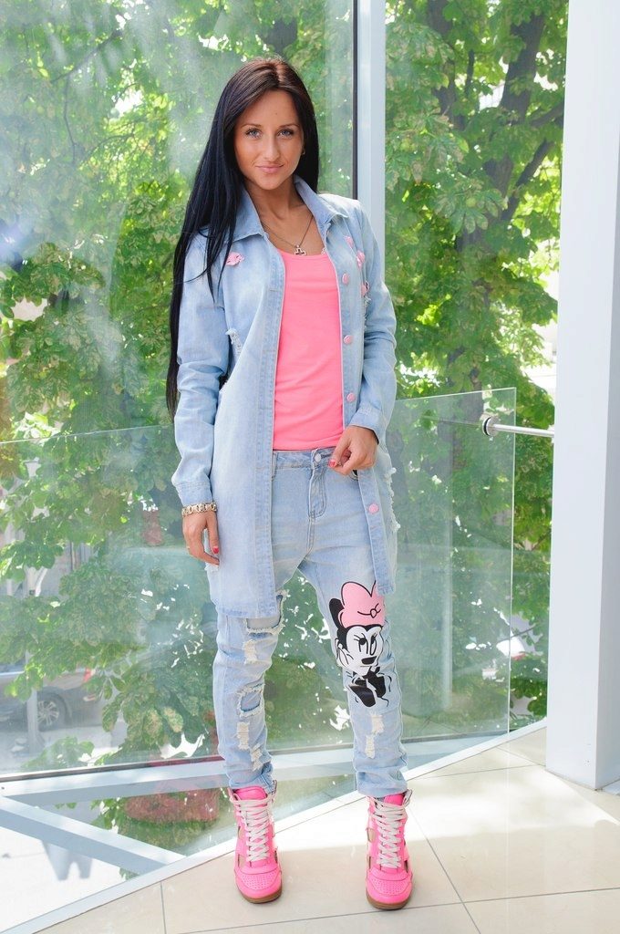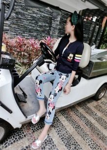 These jeans can certainly be found in the wardrobe of a high school girl or a young girl. Jeans with Mickey Mouse will surely please the girls, preferring casual style or sports clothing options. These jeans look great on young mothers who went for a walk with their baby.
