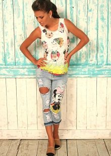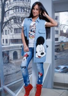The original image with Mickey Mouse on jeans complement the bright, catchy accessories. It can be one or several unusual bracelets, bright glasses, a strap, a beautiful hair band, a rich color handbag, etc.