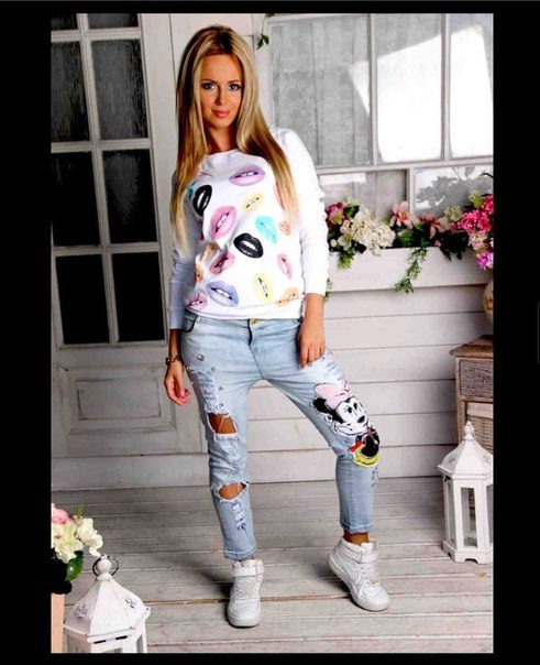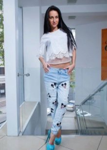 In order that the image did not turn out too "childish" you should not combine such jeans with other things, decorated with equally bright prints. Do not forget the rule that in one image can be no more than two things with prints.