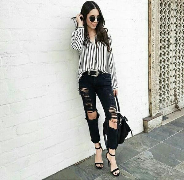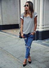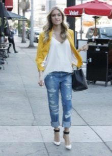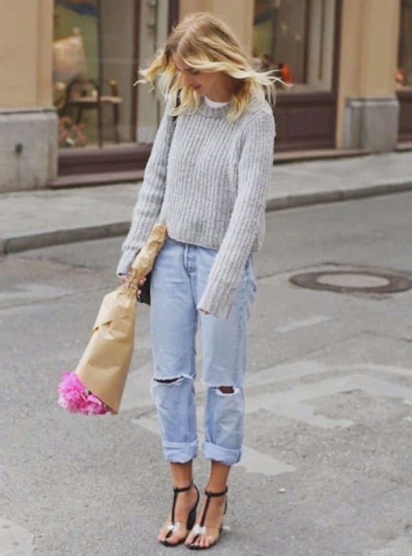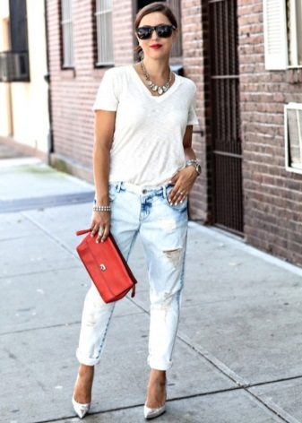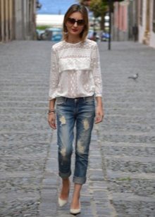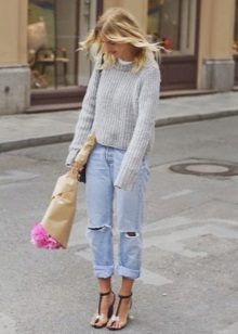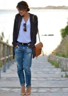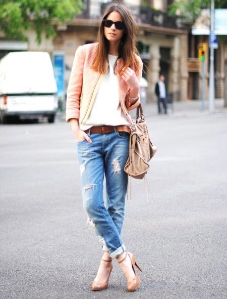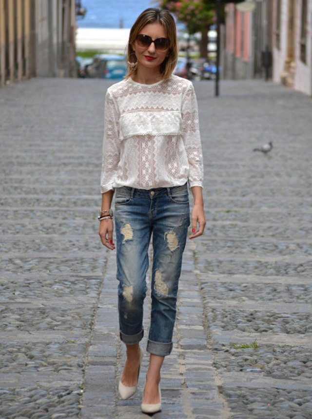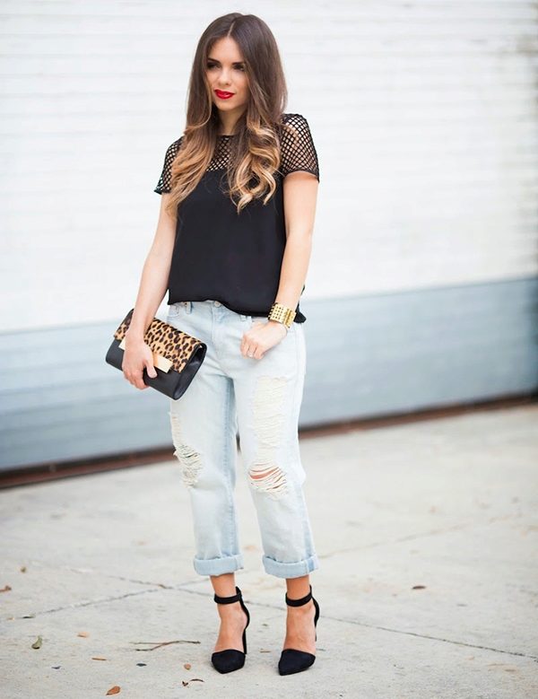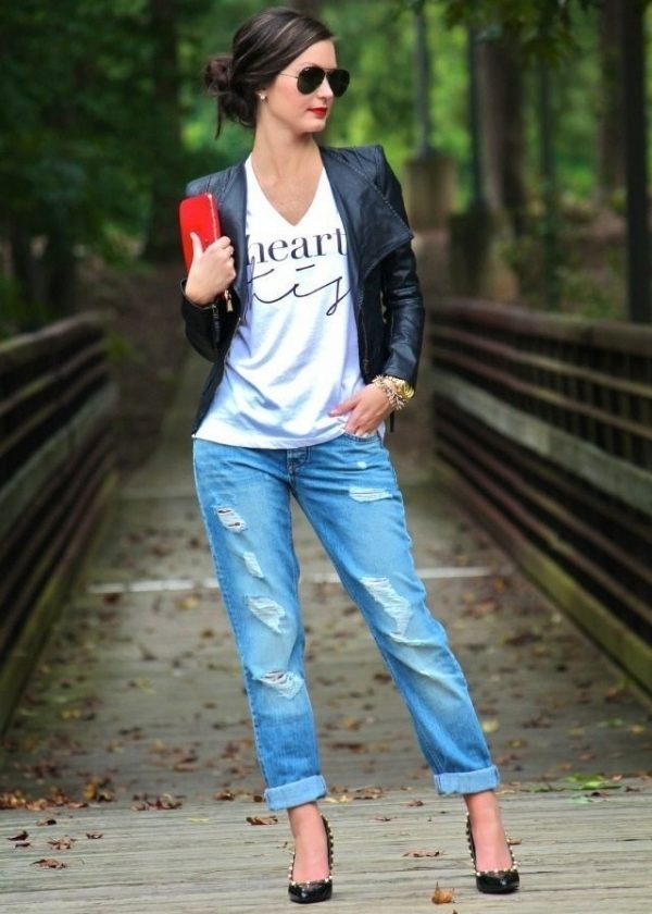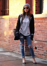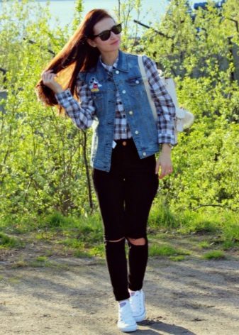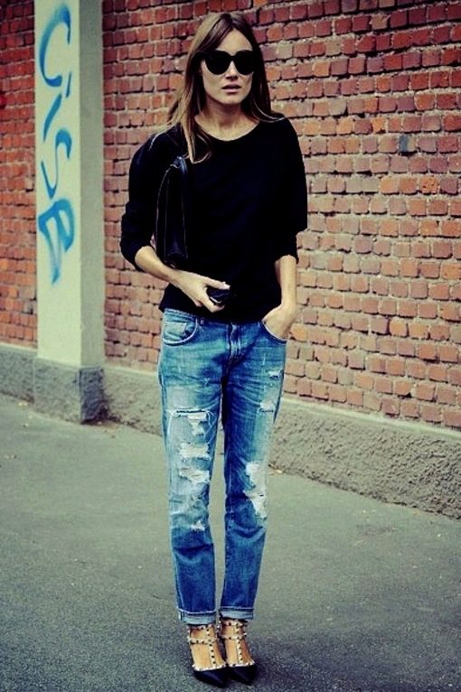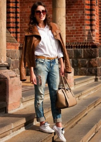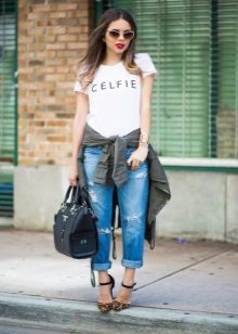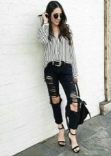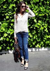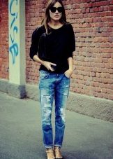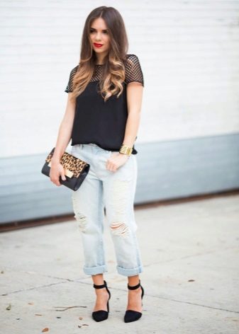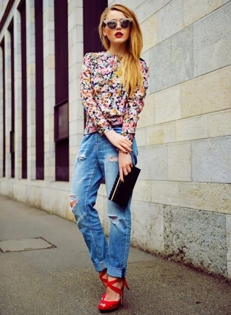 Jeans with backs are casual and grunge style. It is best to combine them with wide shirts, a variety of T-shirts and long sleeves. To create a more feminine look, wear a light blouse and a knit cardigan.