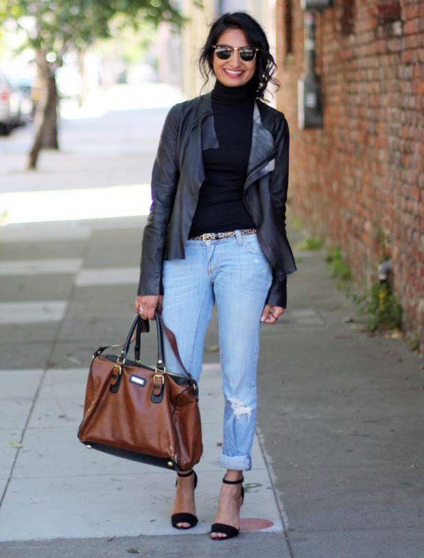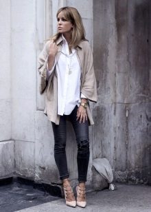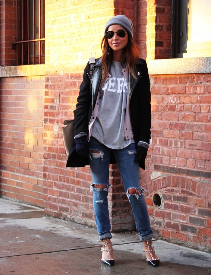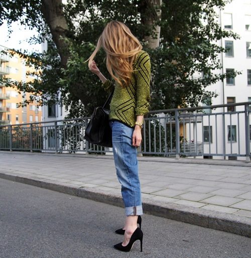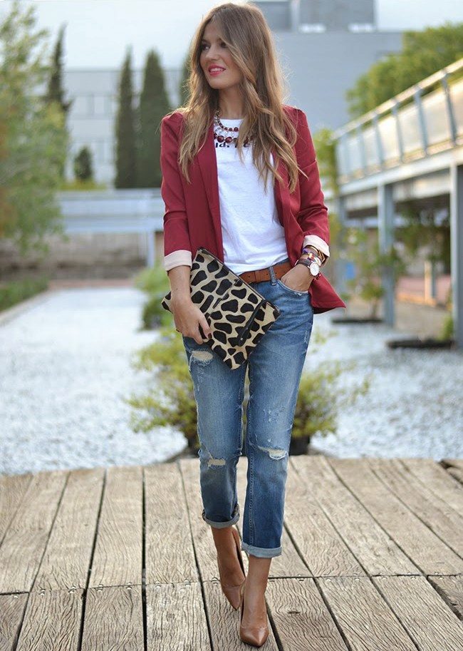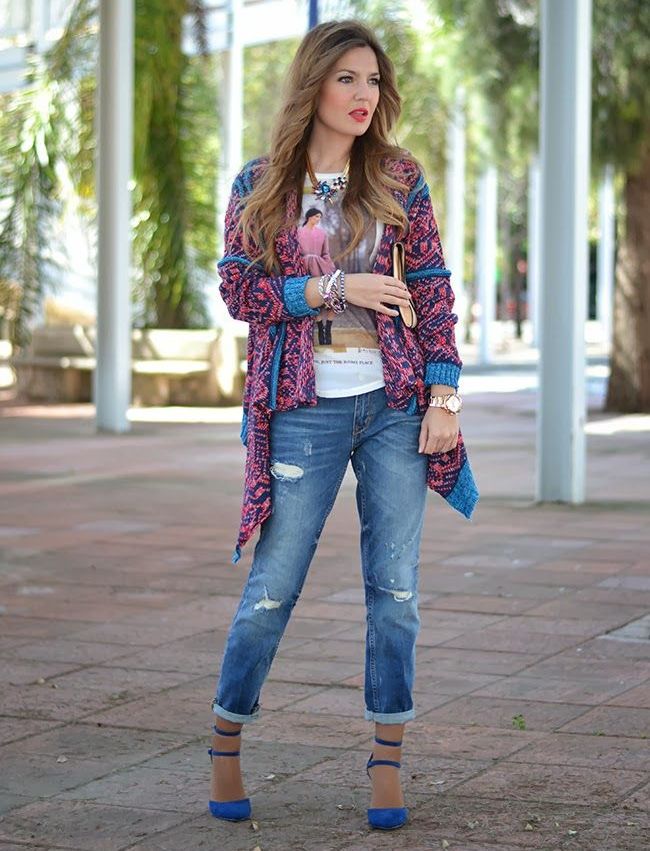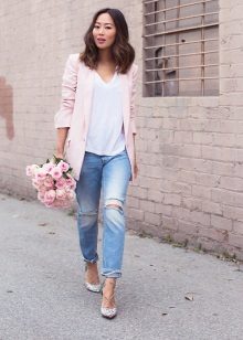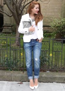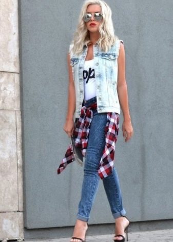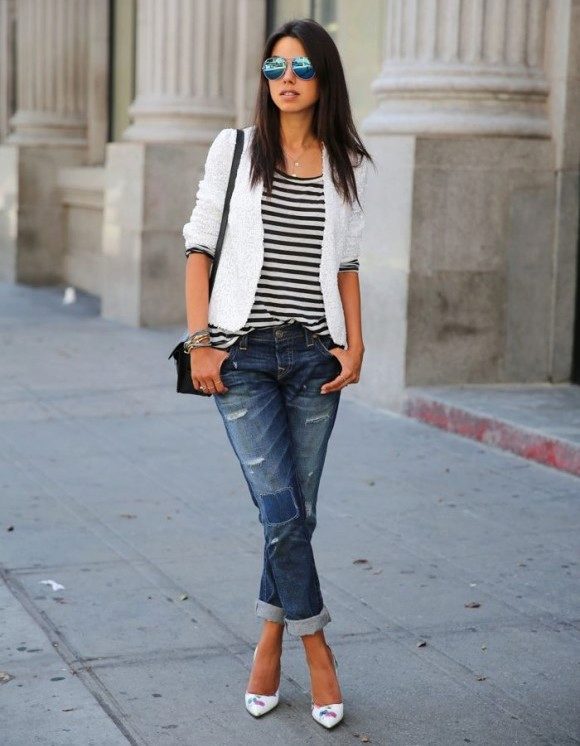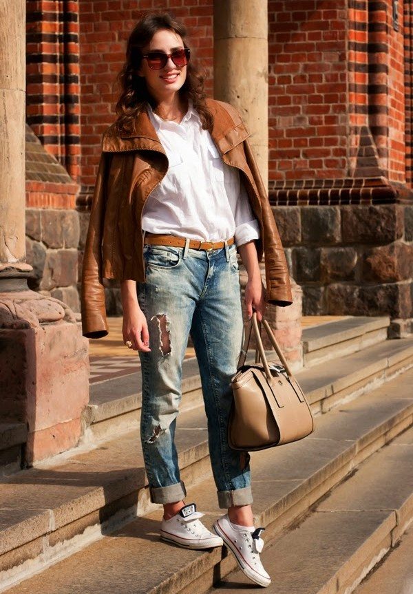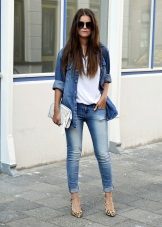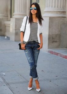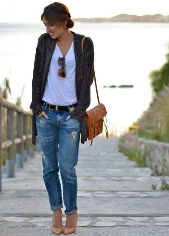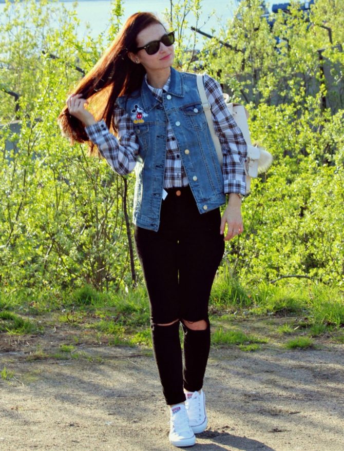Jeans with backs are casual and grunge style. It is best to combine them with wide shirts, a variety of T-shirts and long sleeves. To create a more feminine look, wear a light blouse and a knit cardigan.