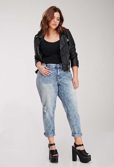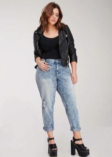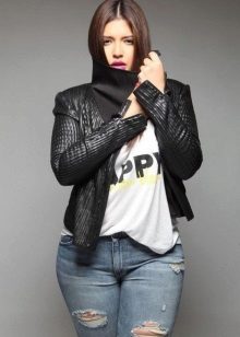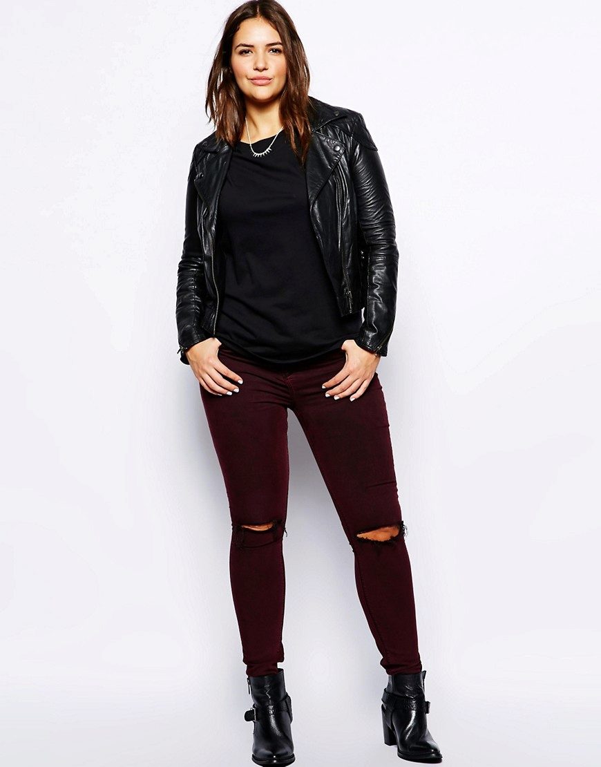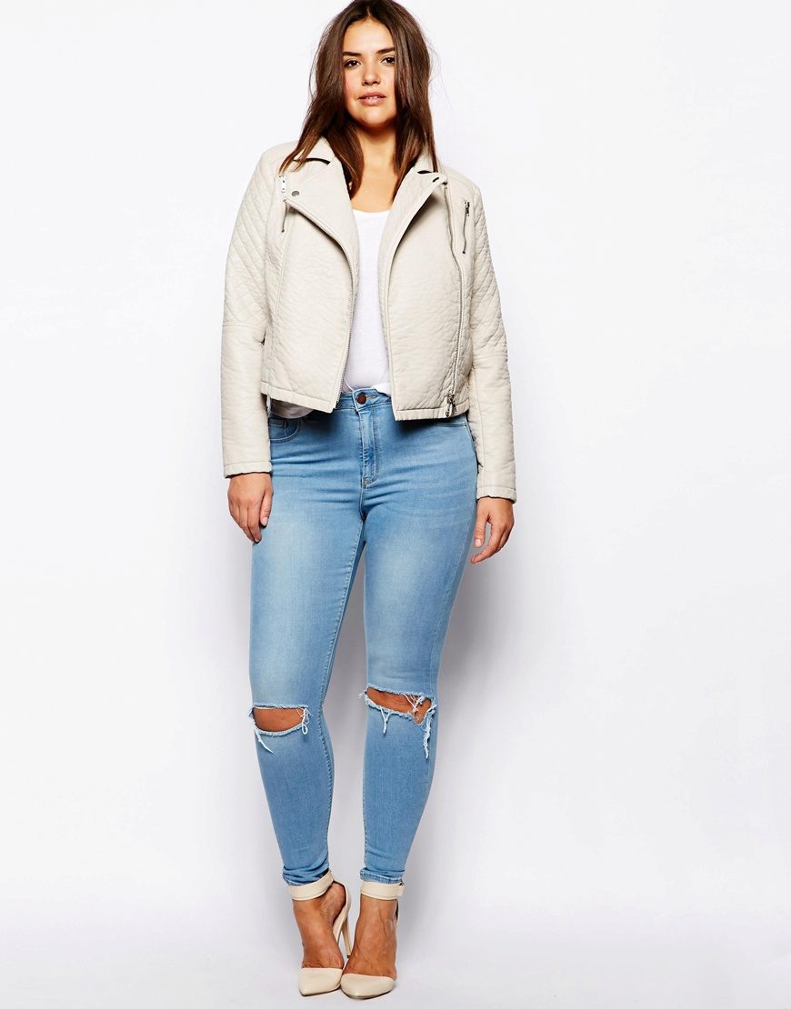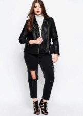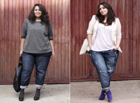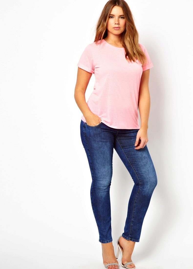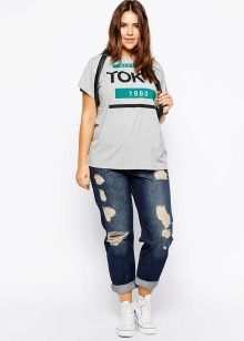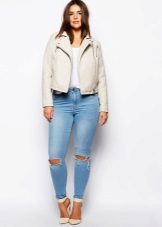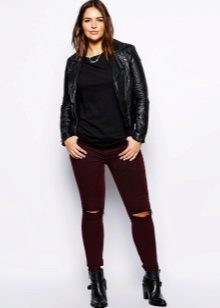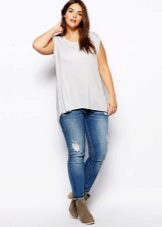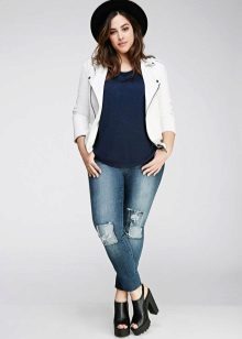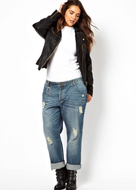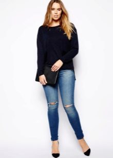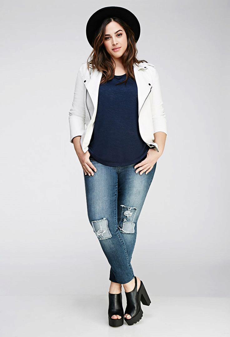 Every plump girl who wants to look stylish and fashionable should have ripped jeans in her wardrobe. They look very nice with leather jackets, pullovers or sweatshirts, long tops and T-shirts, as well as long jackets.