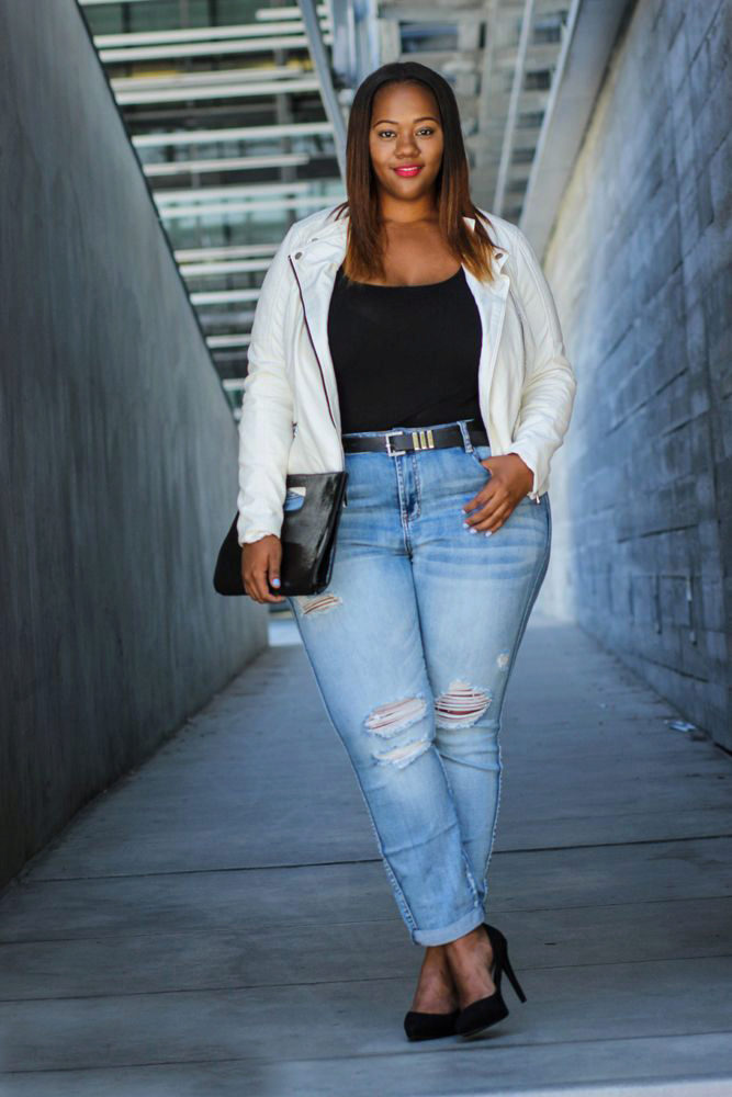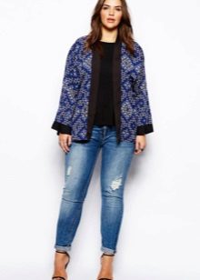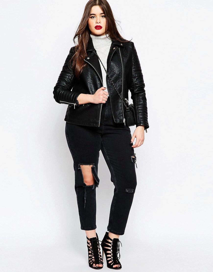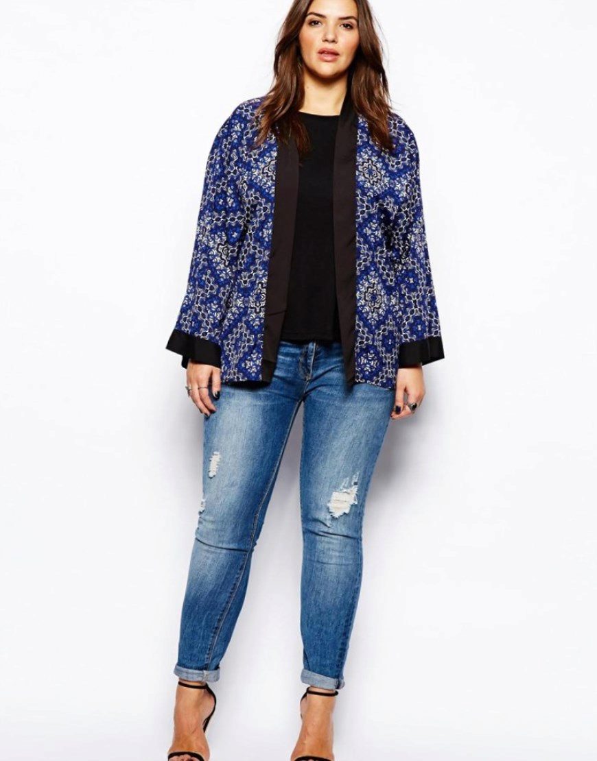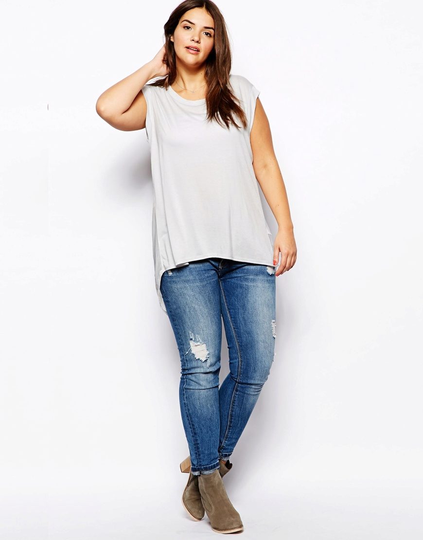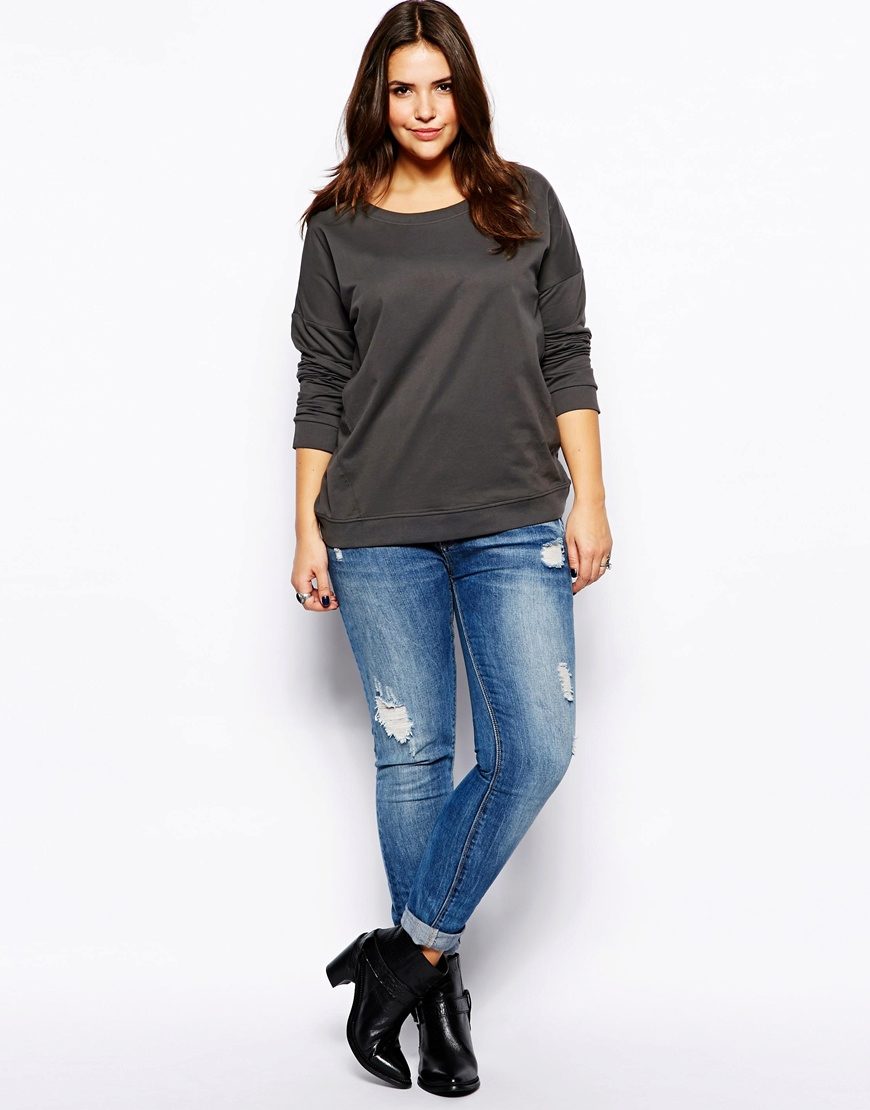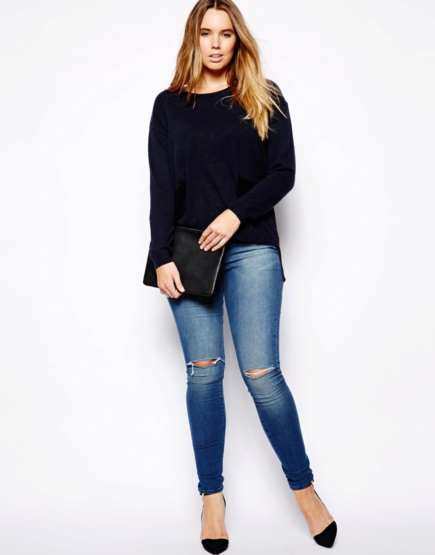 Every plump girl who wants to look stylish and fashionable should have ripped jeans in her wardrobe. They look very nice with leather jackets, pullovers or sweatshirts, long tops and T-shirts, as well as long jackets.