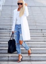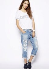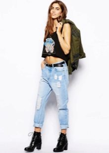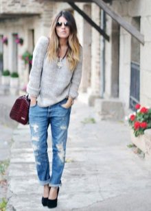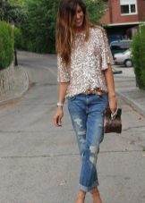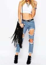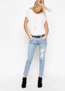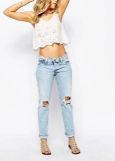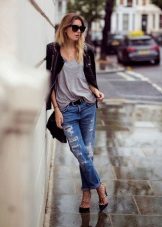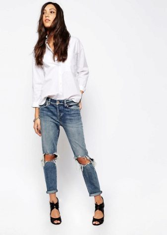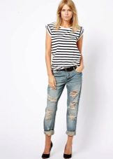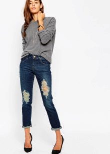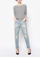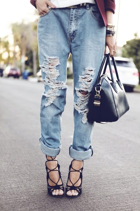 Ripped boyfriend jeans have a loose fit, but this does not interfere with emphasizing femininity, frail camp and slim figure. This style usually has a low waistline, not tight legs.