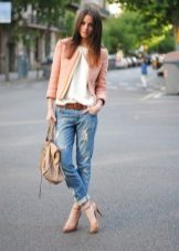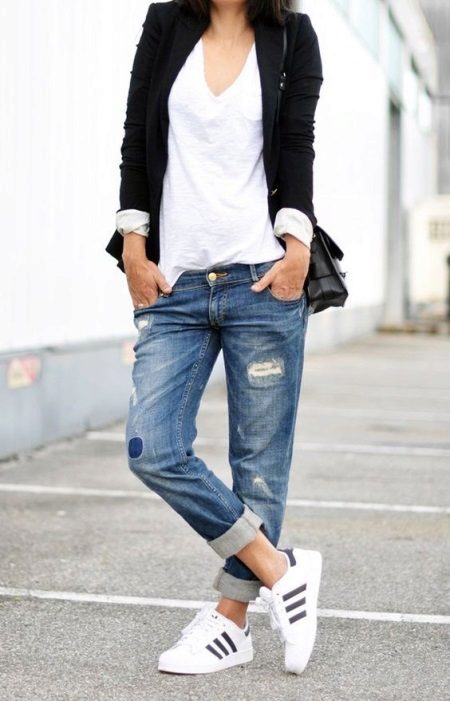 Boyfriend jeans can and should be combined with a jacket, under which you can wear a T-shirt or shirt in a contrasting color. Stylish sneakers in tone with a T-shirt perfectly complete a unique bow for every day.