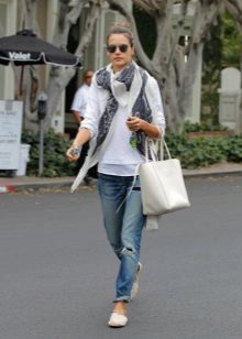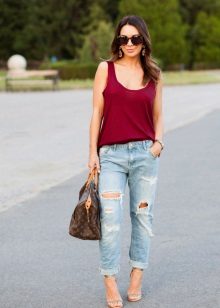 Ripped boyfriend jeans need to be complemented by stylish accents. For example, a small clutch, a handbag on a chain or a backpack will look great in an ensemble with this style.