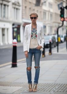 Ripped boyfriend jeans are usually a stylish accent when creating a charming bow for every day. Although if you choose the right elements of your wardrobe, you can go to a party, a walk or a meeting with friends.