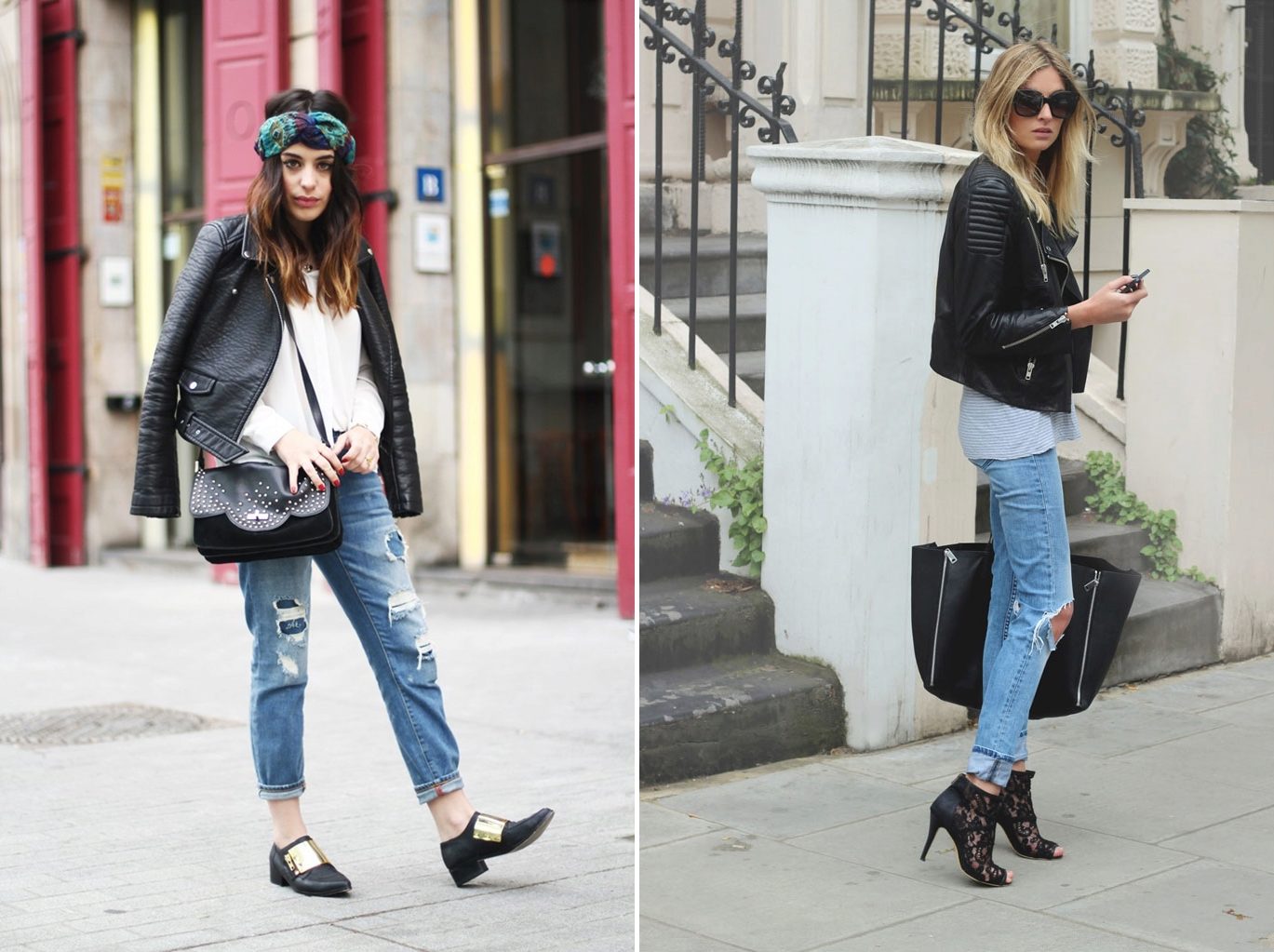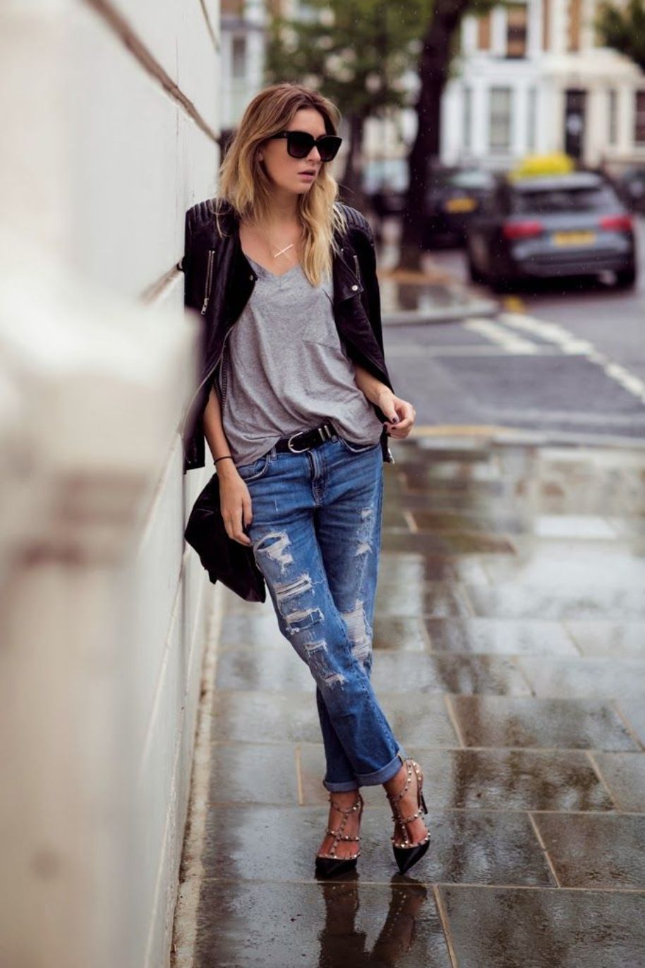 The tandem of ripped boyfriend jeans with a leather and suede jacket looks very impressive. You can stay at the park, jacket, leather jacket or bomber jacket. A classic light-tone T-shirt with a print, “leopard” loafers and black glasses will perfectly complement the street style.