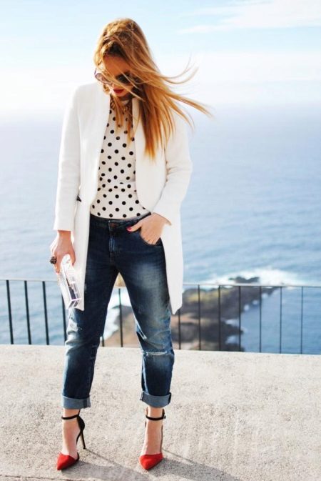 For the embodiment of fashionable bow in retro style, a combination of ripped boyfriend jeans with a white blouse and black peas is suitable. Graceful stiletto sandals will add a feminine look. Red belt will be a bright accent. A small clutch and an elongated white jacket perfectly complement the irresistible bow.