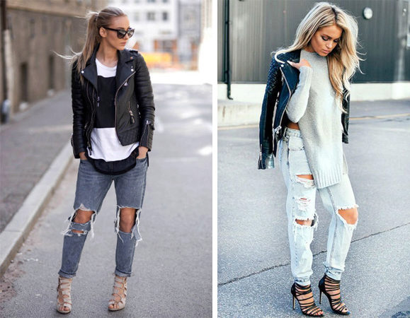 Leather leather jacket is an ideal option for jeans ripped on knees. Wear a long-sleeved, short or long T-shirt under your jacket.