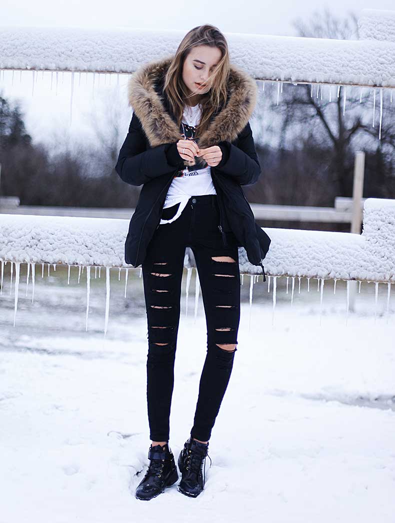 Winter elongated coat, ankle boots and jeans with holes in the lap can be worn in warm winter weather.