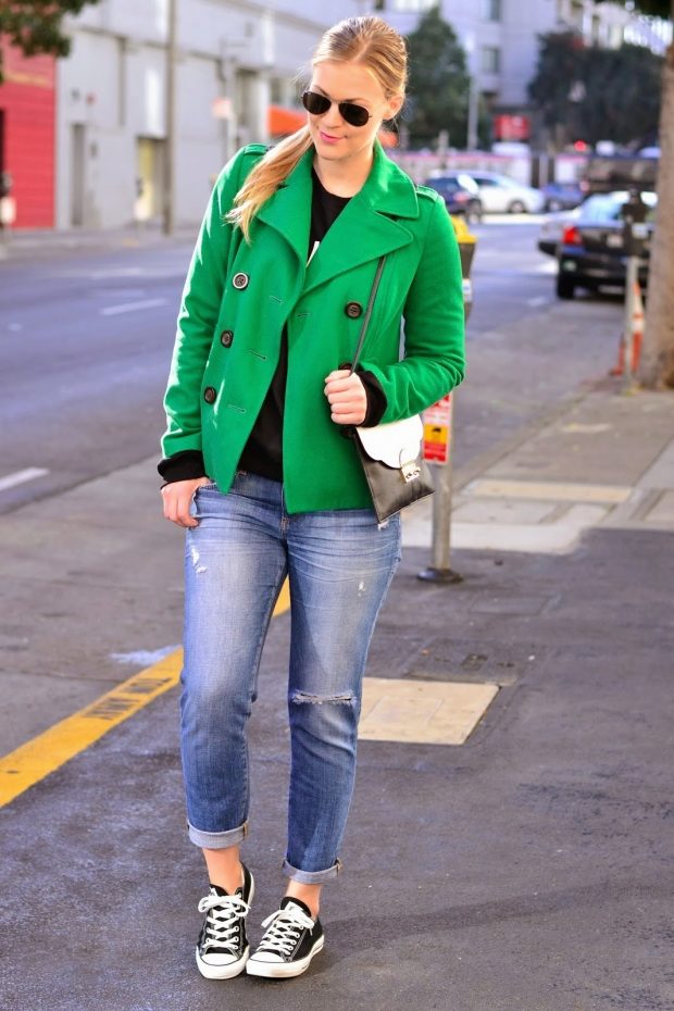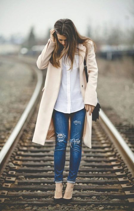 A cashmere coat or knitted coat will look stylish on you in combination with jeans and shoes. Choose an elongated coat or midi-length coat.