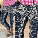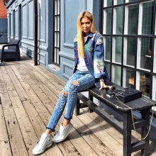 Such jeans are well combined with colorful shirts, blouses and tops with large geometric patterns, floral patterns, bright lettering, etc.
