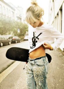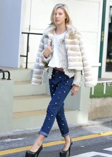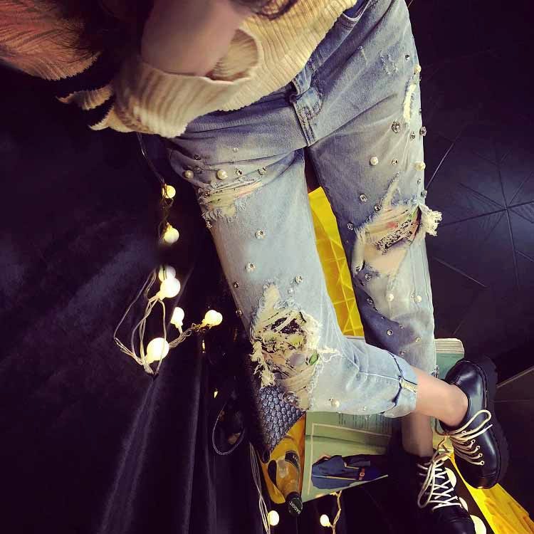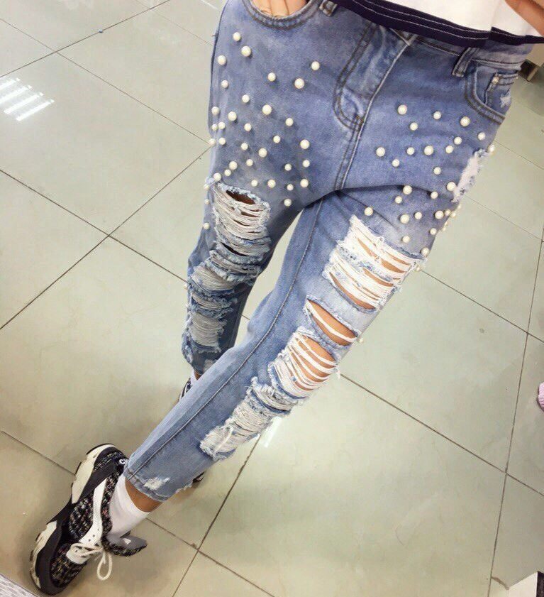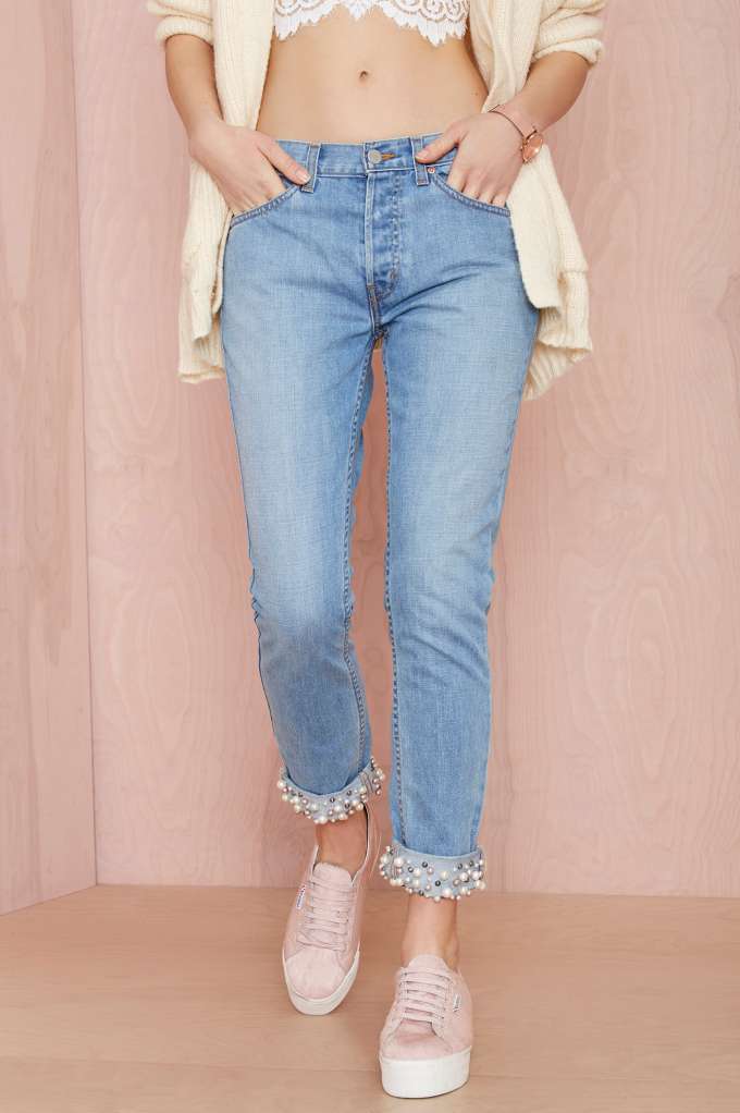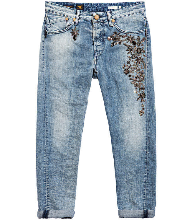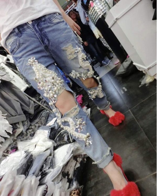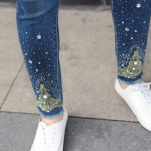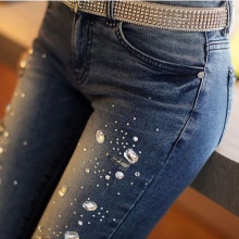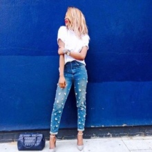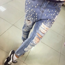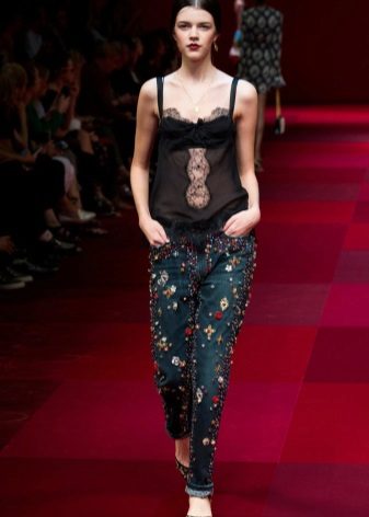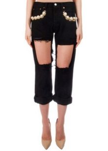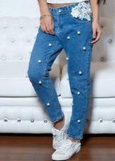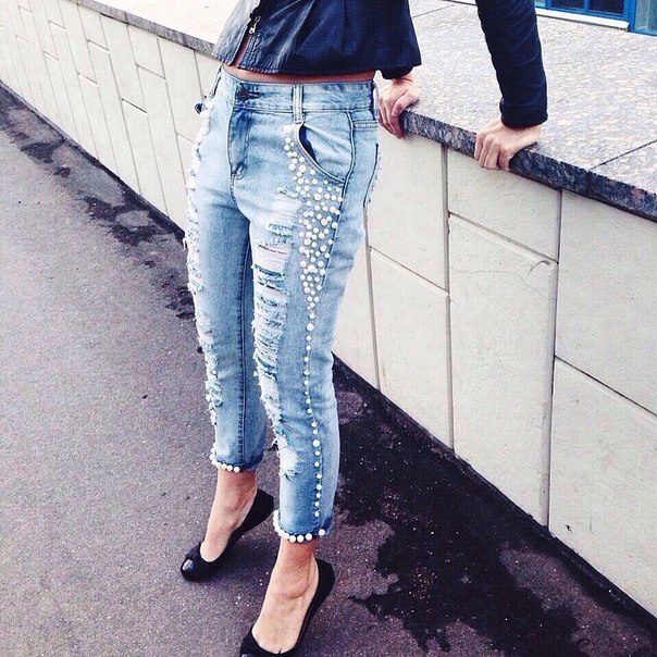 - Boyfriends. The effect that such beaded jeans will produce is based on the game of contrasts: straight, wide pants, tucked downwards - rather male style. Elegant decor in the form of rhinestones or pearl beads soften the image, make it more feminine and sexy.