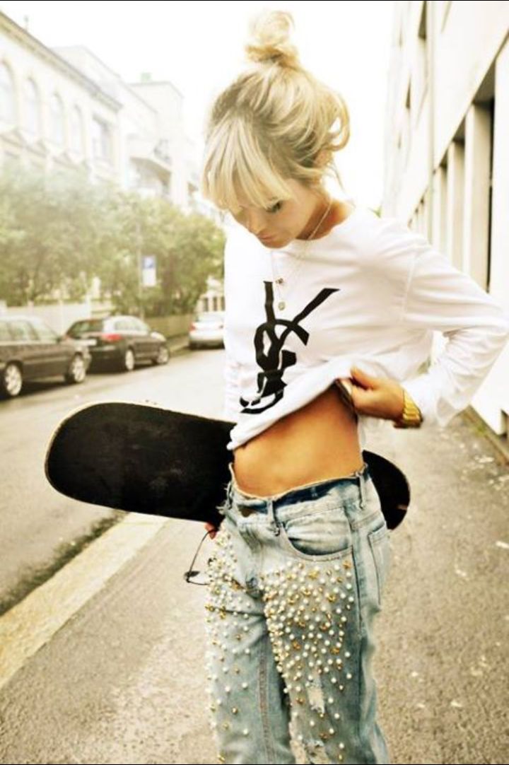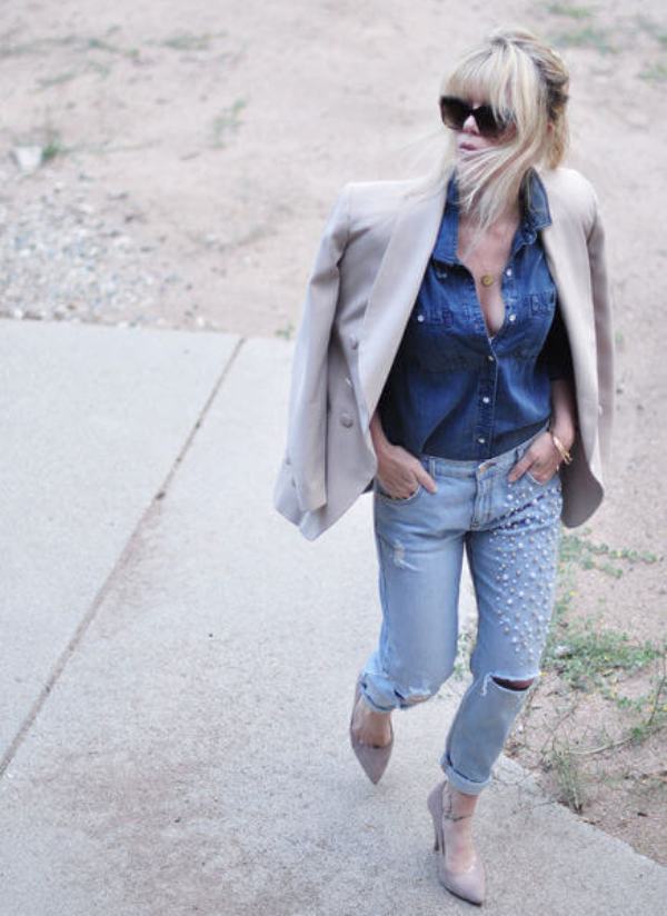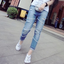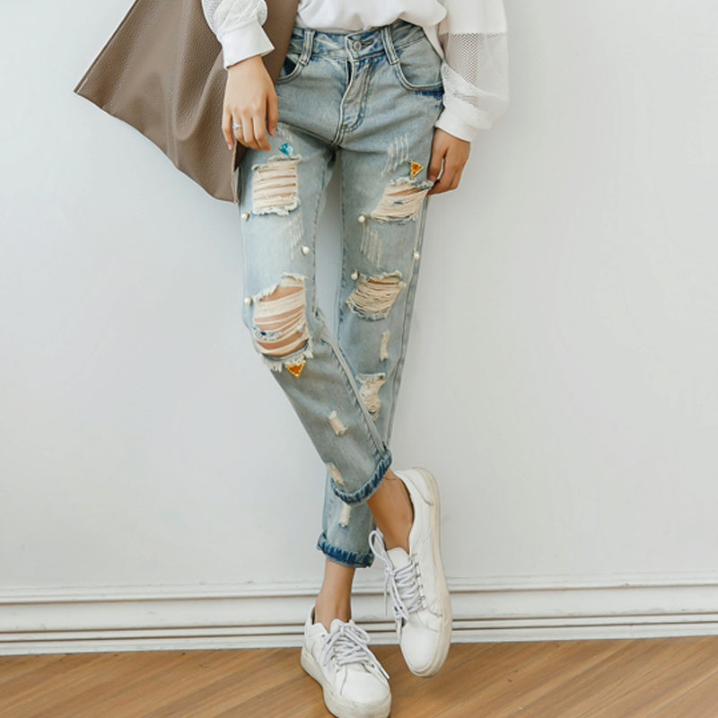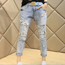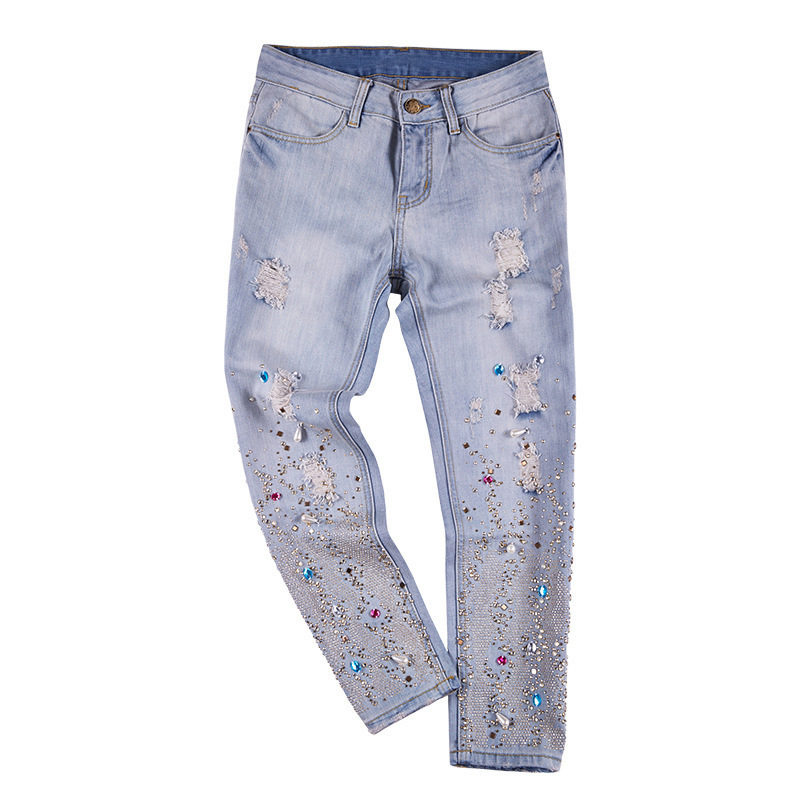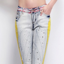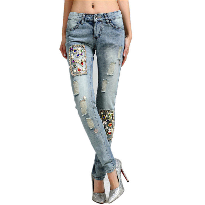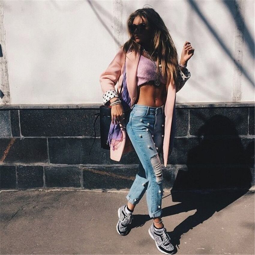 - Boyfriends. The effect that such beaded jeans will produce is based on the game of contrasts: straight, wide pants, tucked downwards - rather male style. Elegant decor in the form of rhinestones or pearl beads soften the image, make it more feminine and sexy.