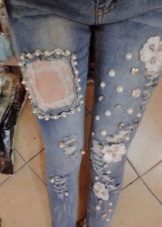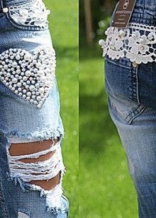 Rhinestones, pearls and beads, used to create the decor, make the most ordinary jeans a model of designer art. This decor is often used in addition with inserts of contrasting in color and texture of materials, such as leather, lace, silk, etc.