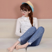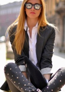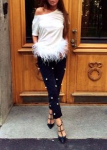 Original look combinations of contrasting clothing color, for example, snow-white top and black jeans. To create a strict, business image, beads or rhinestones, it is desirable to choose to match jeans.