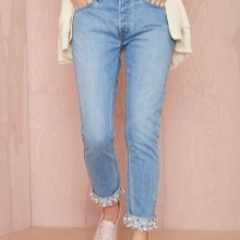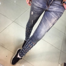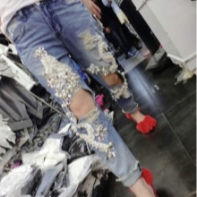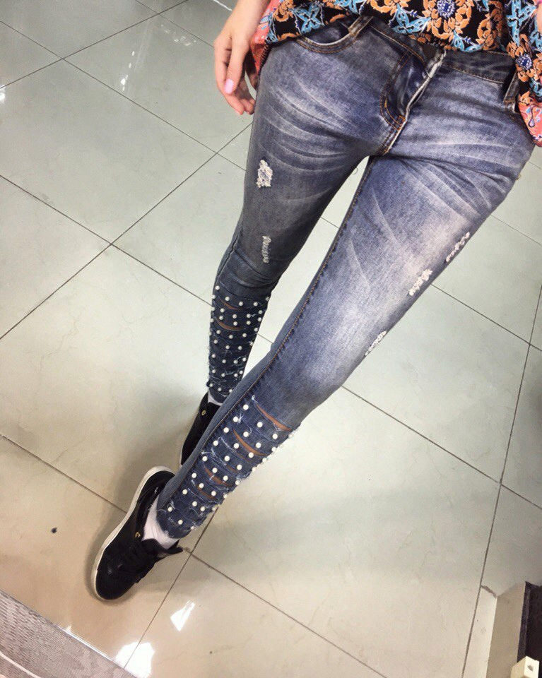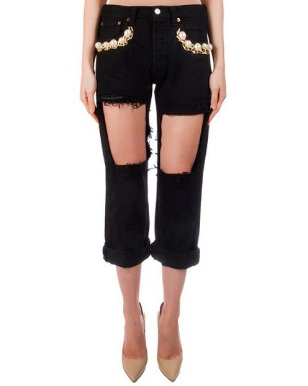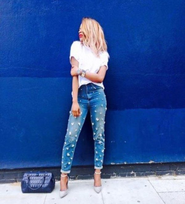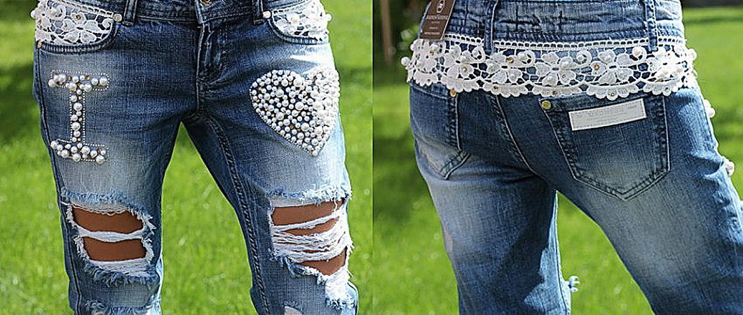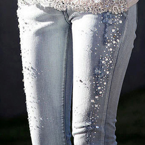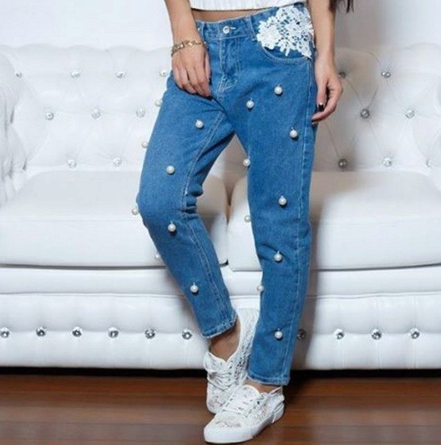 Pearls and rhinestones are considered one of the brightest and most beautiful jeans jewelry. In such elegant, sparkling or shiny jeans, you can safely go to a youth club, to a party, a festive event, etc.
