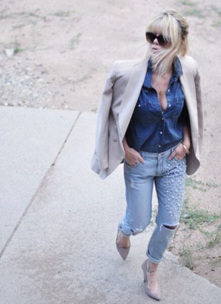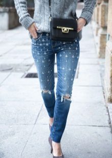 Jeans, decorated with beads, rhinestones or pearls, make it possible to quickly and easily transform even the most modest and strict outfit literally beyond recognition.