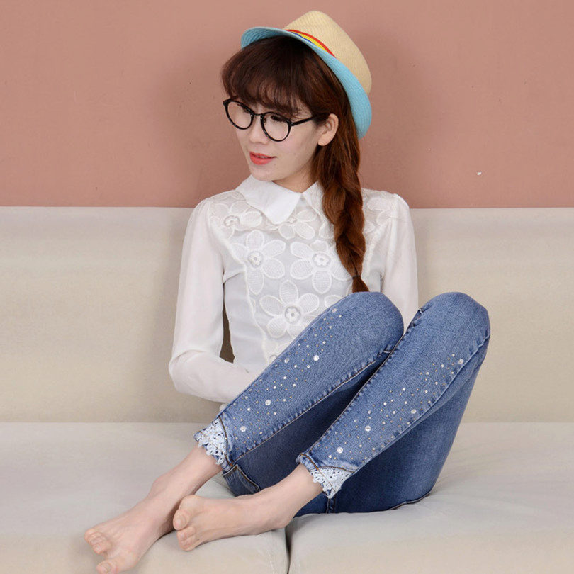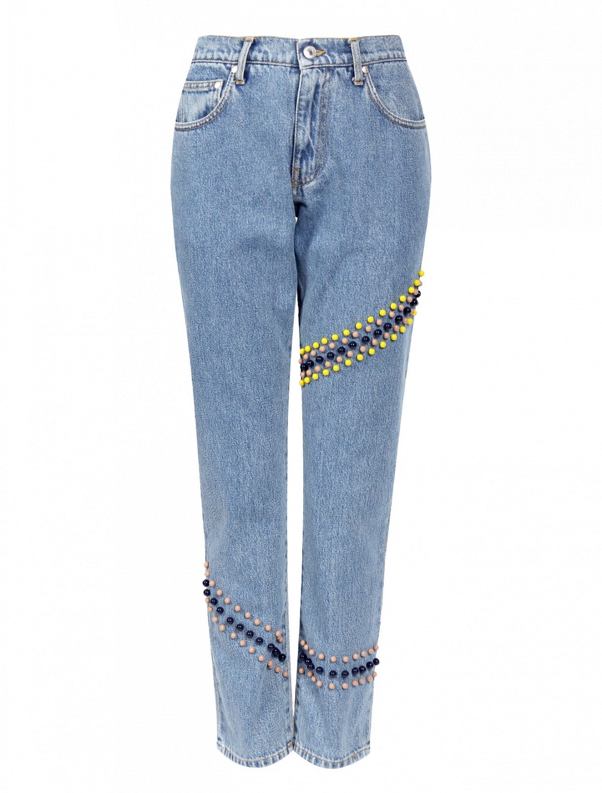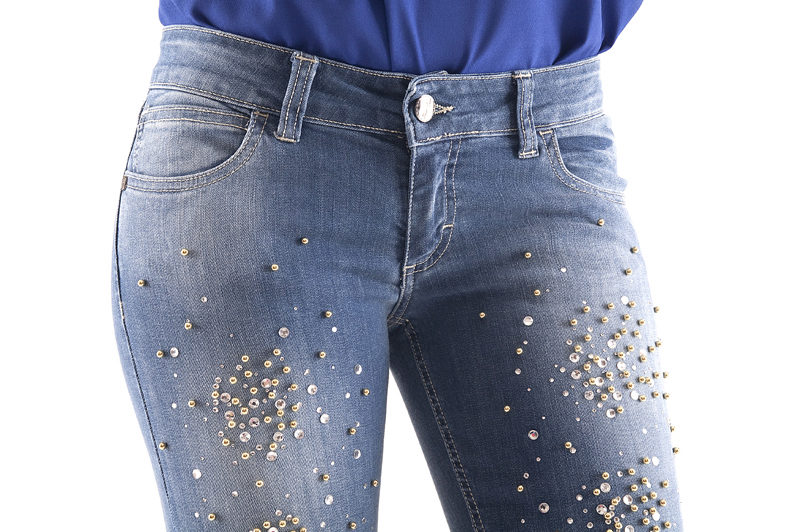 - Classic high-waisted jeans. Very feminine model. It looks perfect with any variants of decorations with colored or transparent beads.