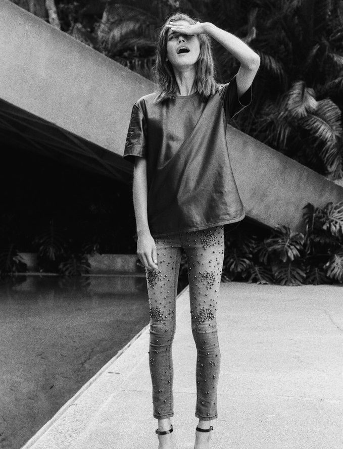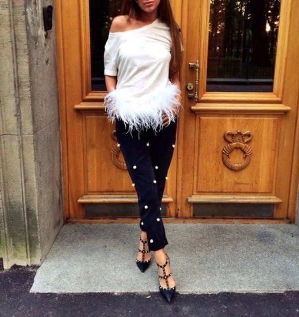 Beaded jeans are undoubtedly the main focus of any image. Therefore, it is customary for these jeans to choose a more calm and strict top, for example, a smooth monophonic top, a classic T-shirt, a strict-style blouse, etc.