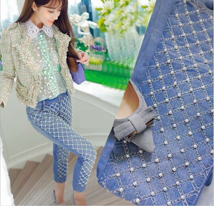 Pearl beads and rhinestones give even the most ordinary jeans a simple cut a refined and expensive look. Decorated in this way, jeans can easily become the basis for creating an image in a romantic, glamorous, classic style.