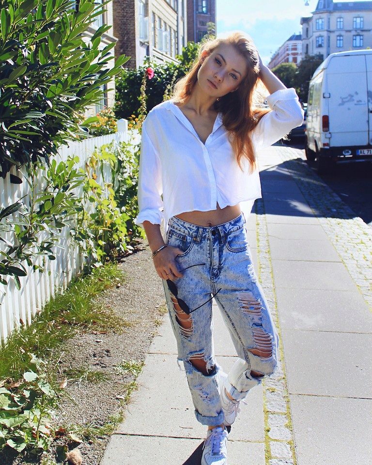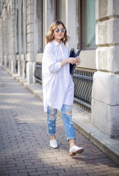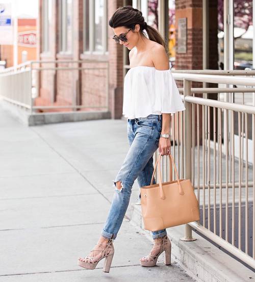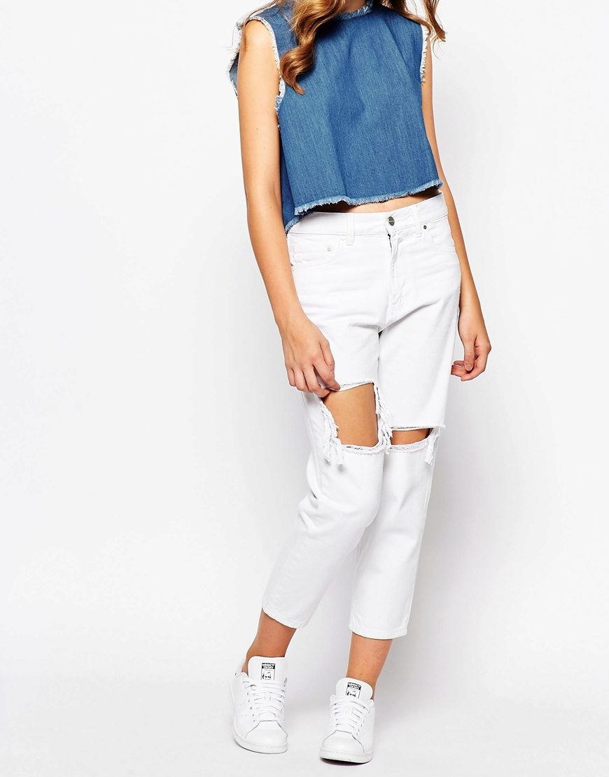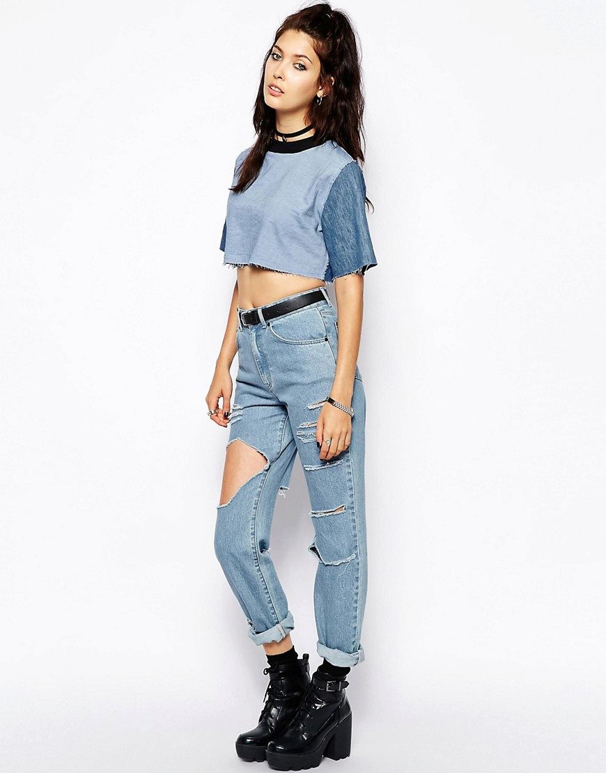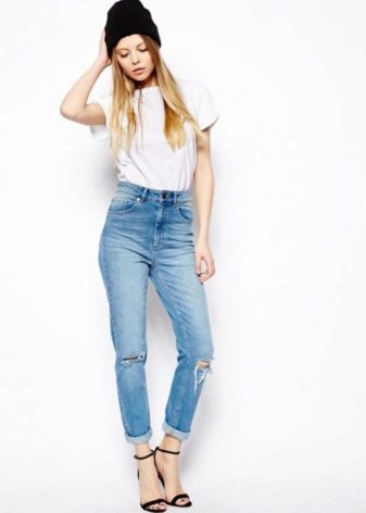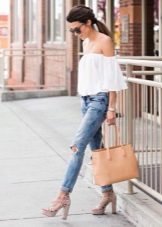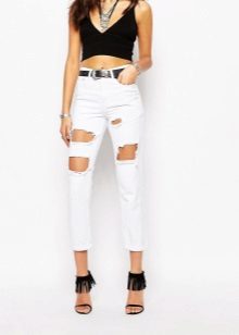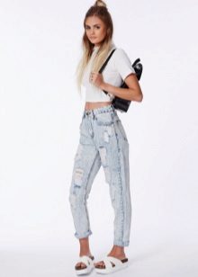- Mike, top. In the midst of a hot summer minimalism is relevant. Both t-shirts of any styles, and crop-tops that are especially relevant now, are equally well-suited to ripped jeans. Sandals, pointy ballet flats or sneakers will complete such an ensemble.