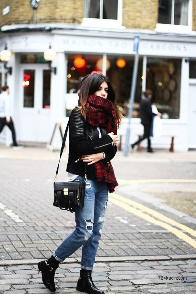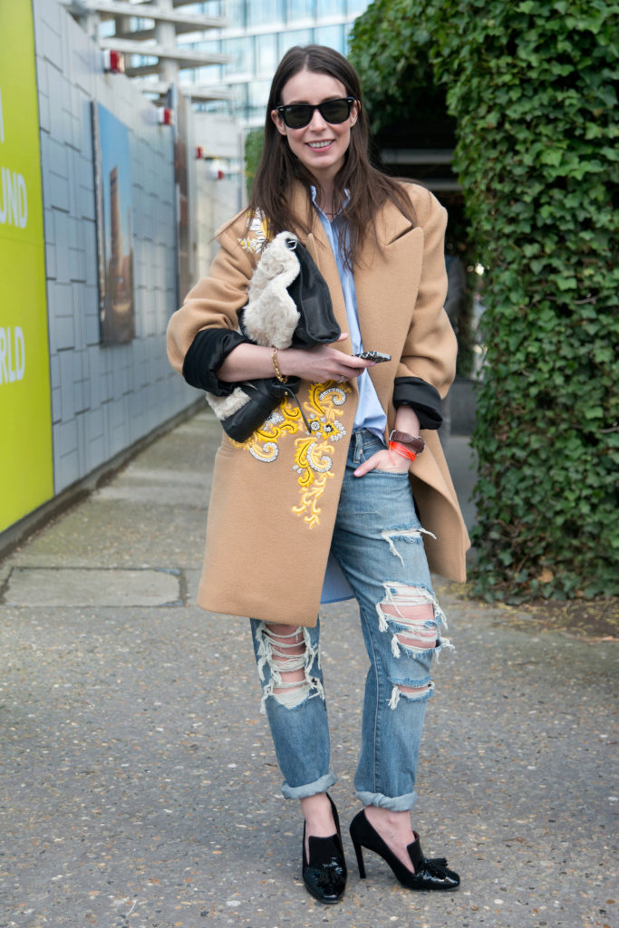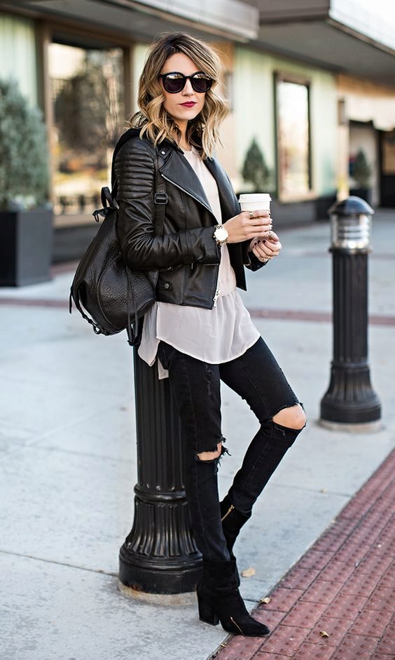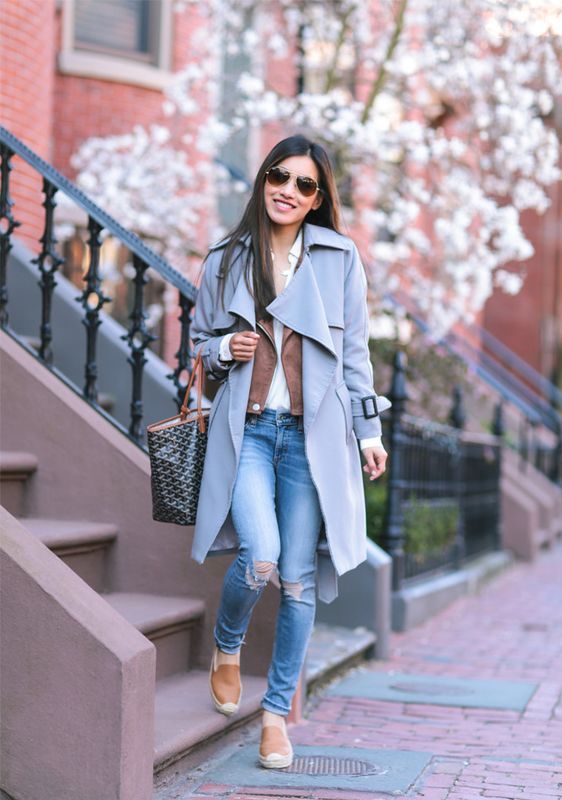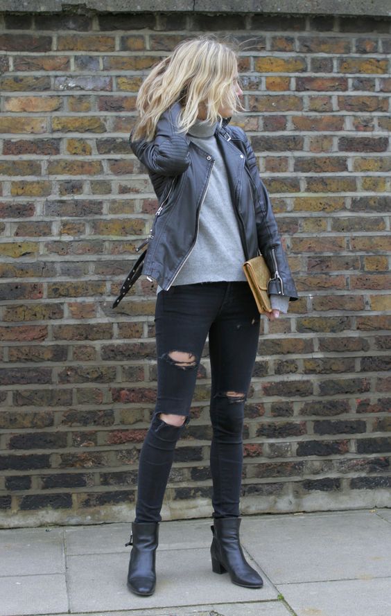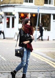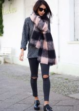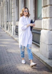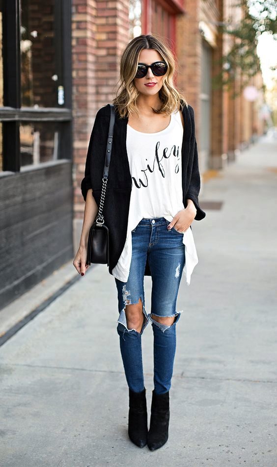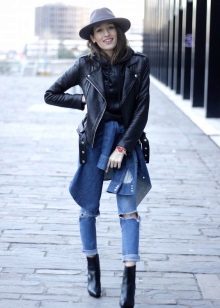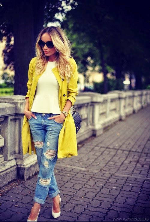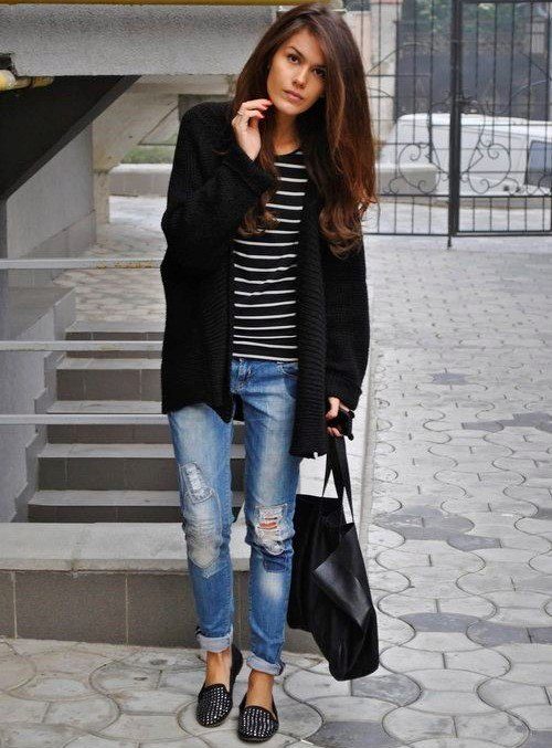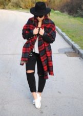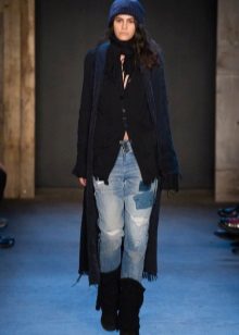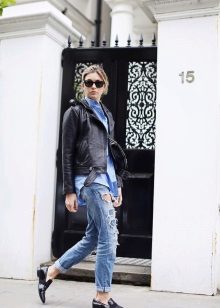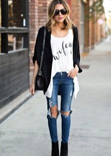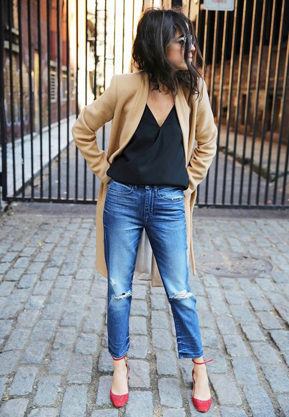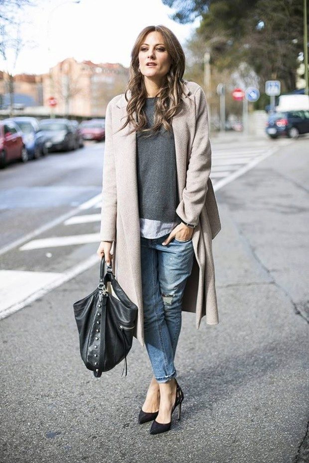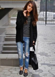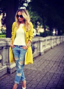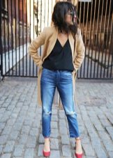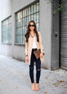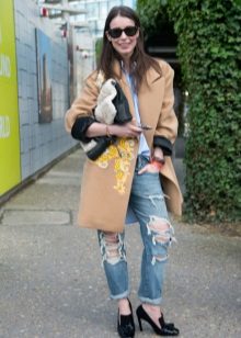 • Coat. Another autumn-spring option is ripped jeans with a knee-length coat. From shoes, shoe boots are ideal here - on a heel or a flat sole, as well as any closed shoes and half boots.