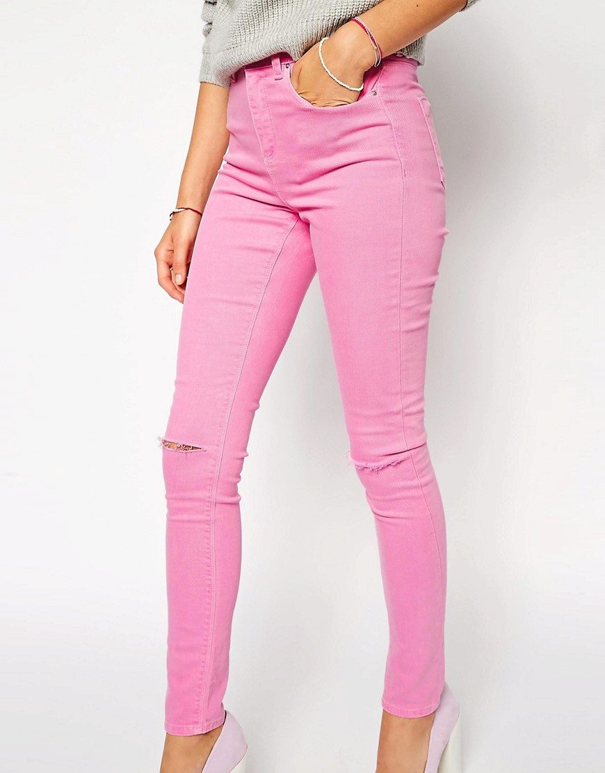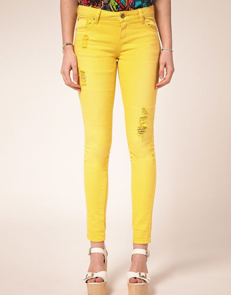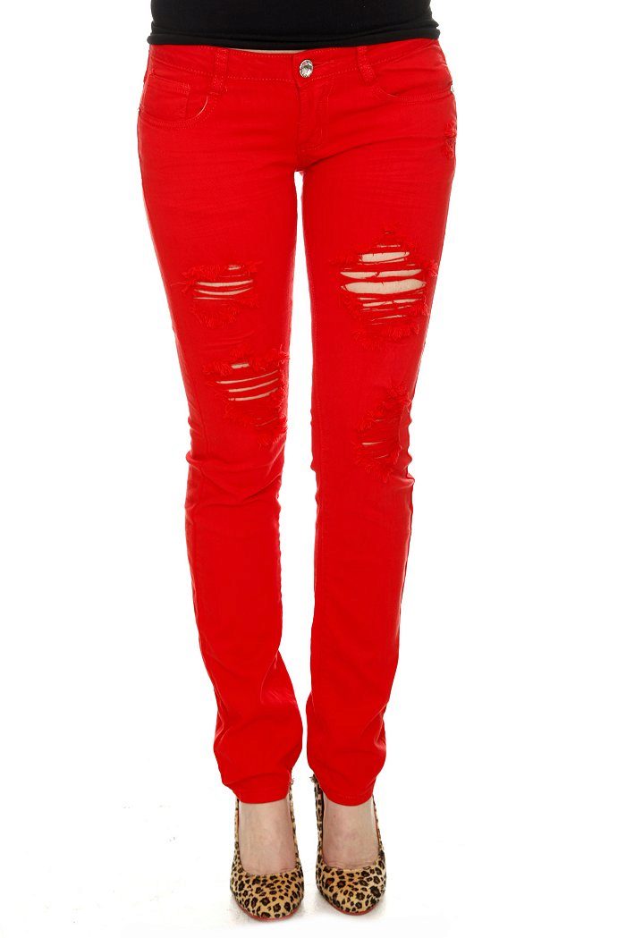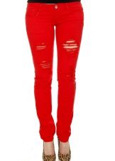 Skinny with strong scuffs almost the entire length of the leg will look great in red, green, yellow or pink tones.