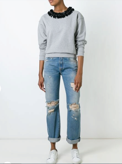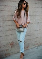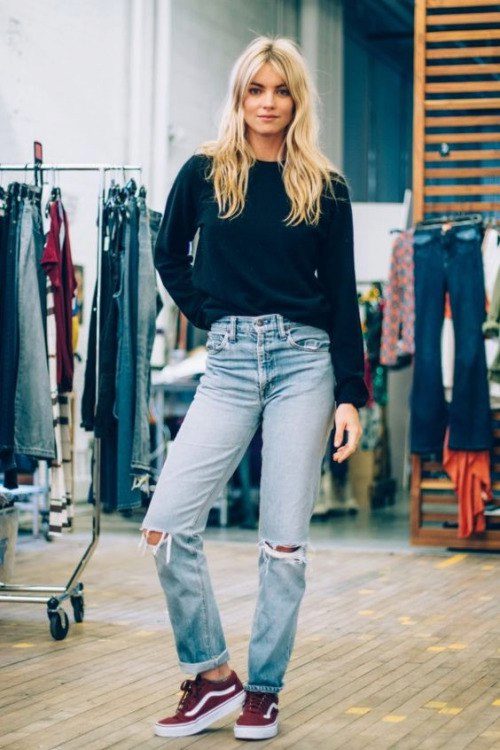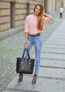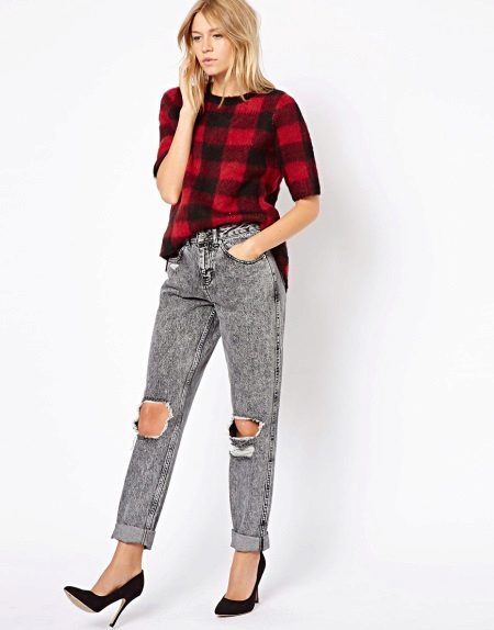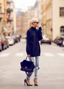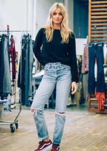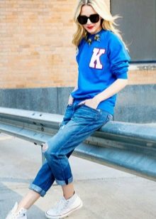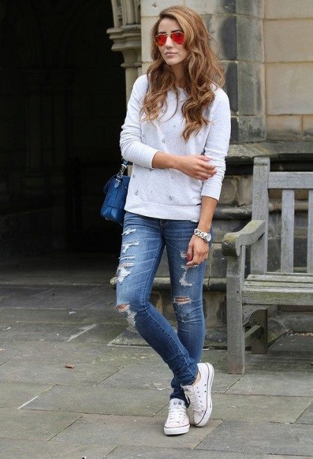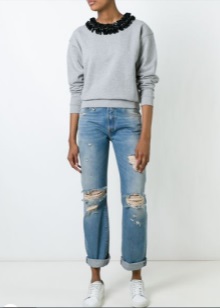 - Sweatshirt, pullover. This soft and comfortable piece of clothing matches perfectly with any jeans. And with trendy ragged denim trousers, you can create a mass of stylish ensembles. Perfect for cool weather. If you choose a sweatshirt with a print, the shoes may be coarser and more colorful. Under a monochrome pullover, it is better to put on elegant shoes.