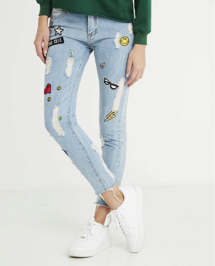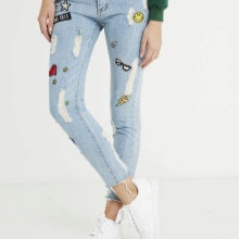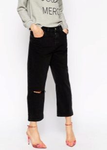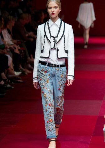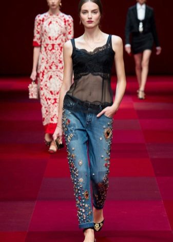 Let torn jeans are no longer a symbol of freedom and rebellion, but excessive decoration still does not "fit" them. Holes should be the main "chip" of such a thing. Although, of course, lovers of glamor have the right to add rhinestones or sequins to them.