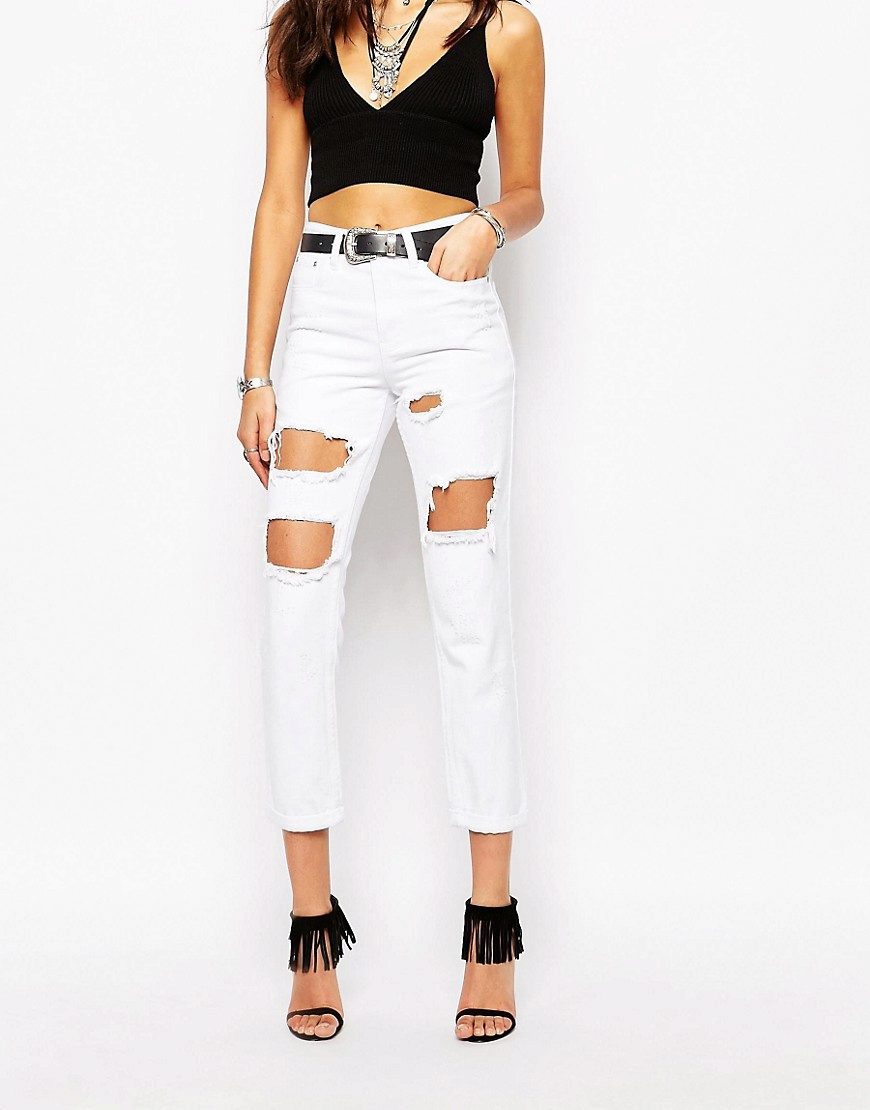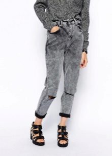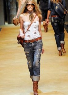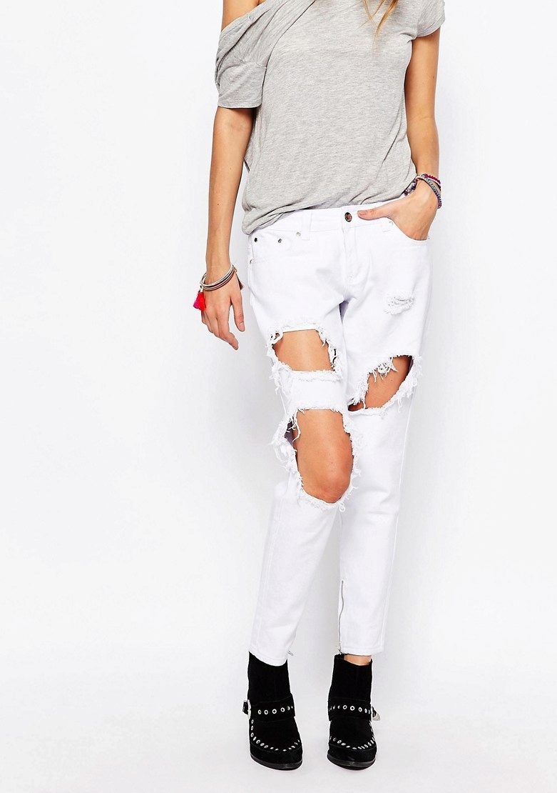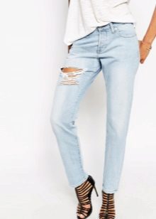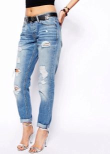 This season will be relevant absolutely any styles and models of ripped jeans.. There is only one rule for choosing - they should sit perfectly on you. Owners of slender legs can opt for a skinny with a lot of scuffs and scratches. Today, the most fashionable will be jeans, which cut up to 50% of the surface. Such tests stand out well and straight pants, as well as the model "boyfriends."