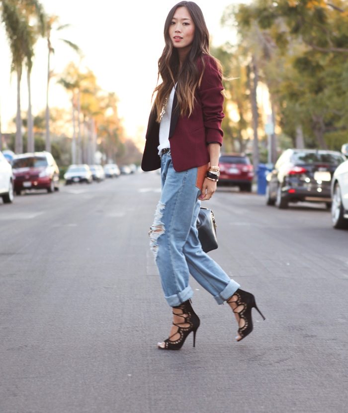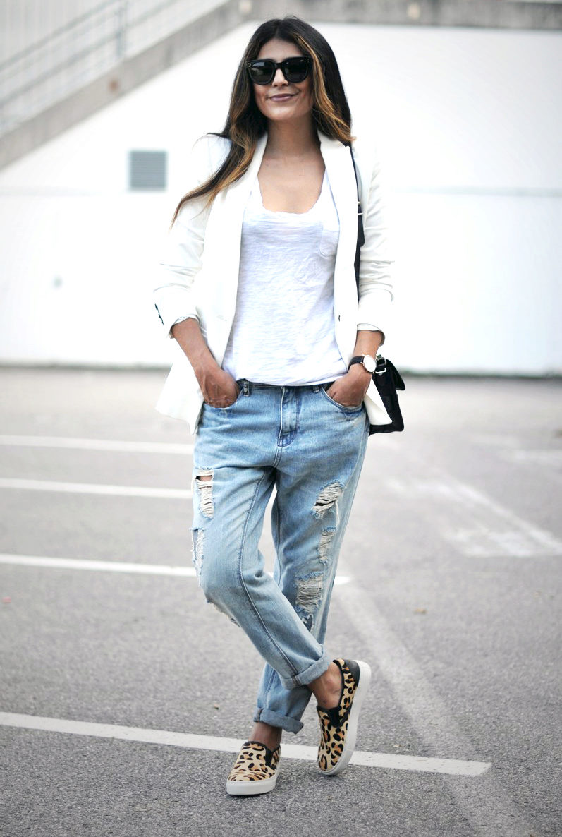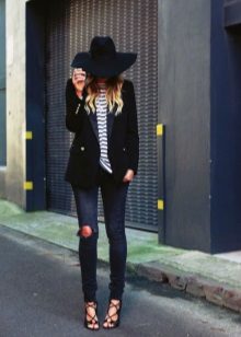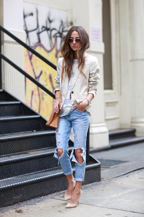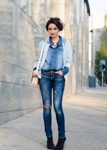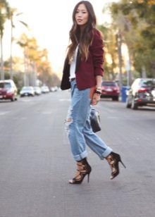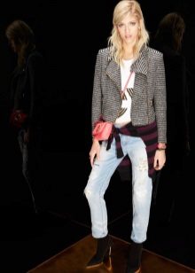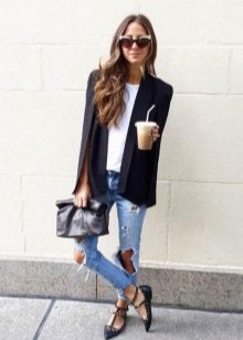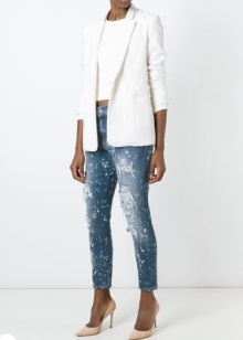 • Blazer. Option for fans of contrasts. The subject of a strict office style effectively looks paired with shabby jeans. A jacket in such an ensemble should be necessarily short (up to the upper line of the hips or even higher). But in matters of the color palette for a jacket with such a suit there are no restrictions - it can be from any scale or even with prints. Shoes - boats or ankle boots.