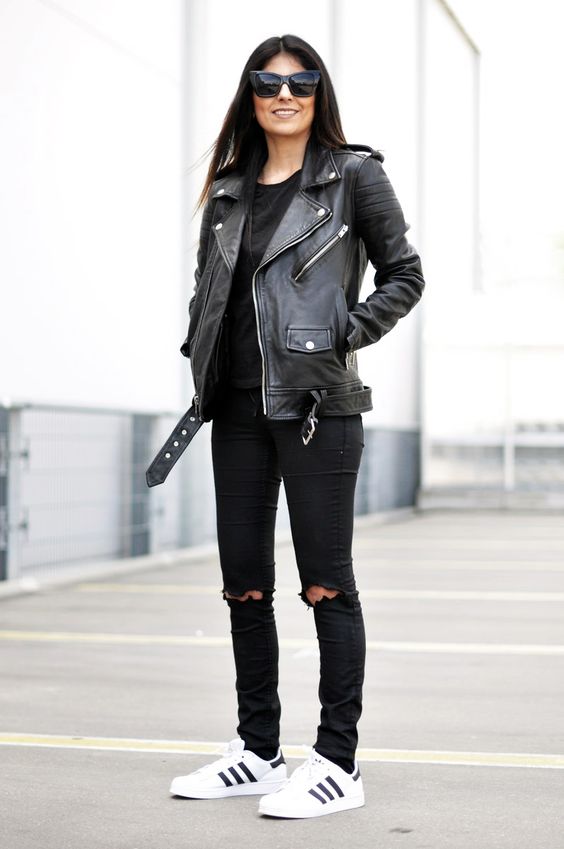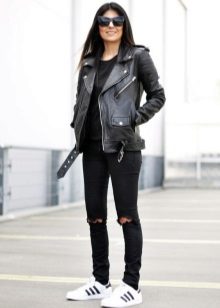 • Leather jacket. Combination option for a cool summer evening or autumn / spring. Under the jacket you can wear a shirt, top, turtleneck. Shoes to complete this outfit are court shoes, rough shoes, or thick sandals. You can pick up here and sneakers or sneakers, but it will be a more boring option.