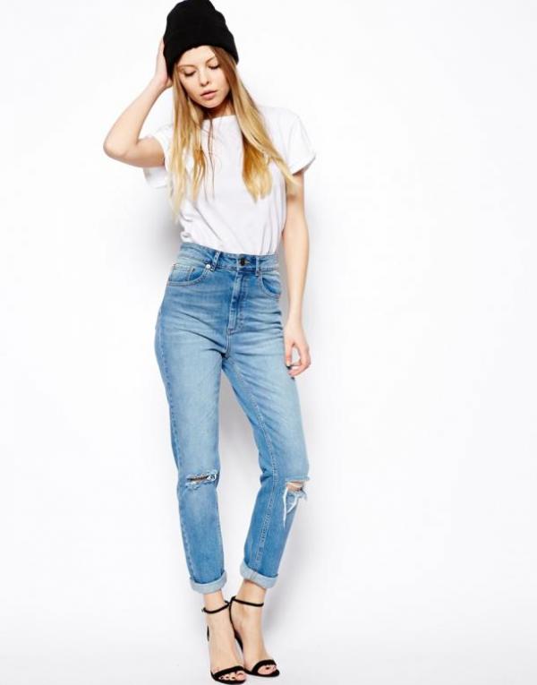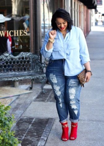 • Women who have a figure with full hips, it is better to opt for jeans straight cut. At the same time, the holes and cuts here should be vertical - this will stretch the silhouette of the figure and visually add you a couple of centimeters of growth. At the same time there should not be too many holes. Their maximum concentration here should be 10-20 cm above the knee.