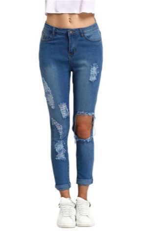 To create a truly fashionable, and not absurd thing, holes and scuffs should be done exclusively in the area of the legs. In the hip area (both front and back) and on the buttocks, these elements are unacceptable and inappropriate. The exception is the rear pockets.