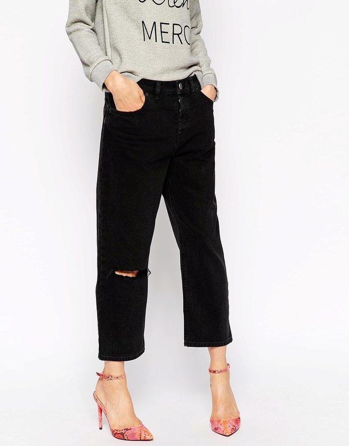 Pants, bananas, speckled with scuffs and holes, will look stylish and relevant this season. Like greetings from the past: popular in the 80s-90s, these jeans seemed to have been found by you on the mezzanine and preserved the story of how your mother used to wear them. Complement the stylish image of small gateways.
