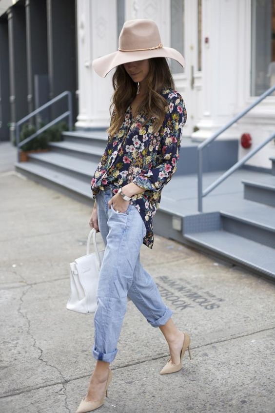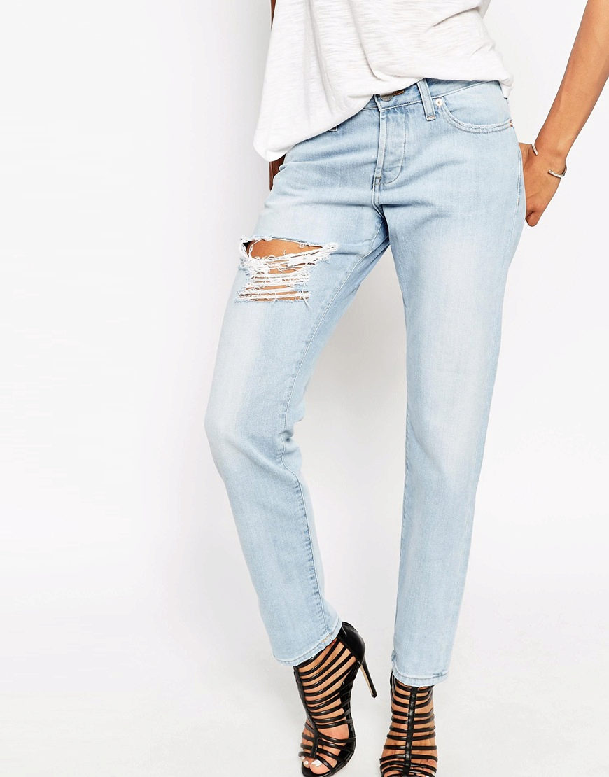 Faded boyfriend jeans are preferred in a soft blue version.