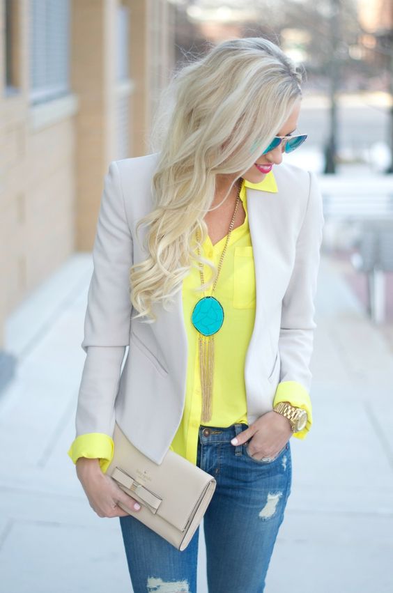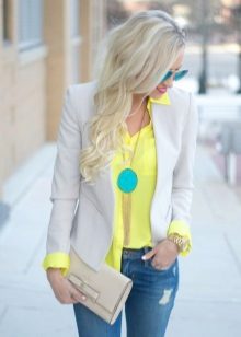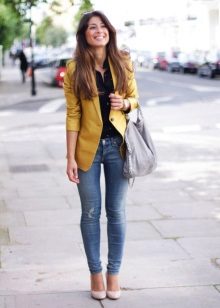 Yellow jacket is perfectly combined with a vest. It turns out a "lively" and stylish look. If you are afraid to overdo it, it is better to give preference to basic things of a simple cut, white or black. It will be the perfect complement to light jeans in a simple summer look.
