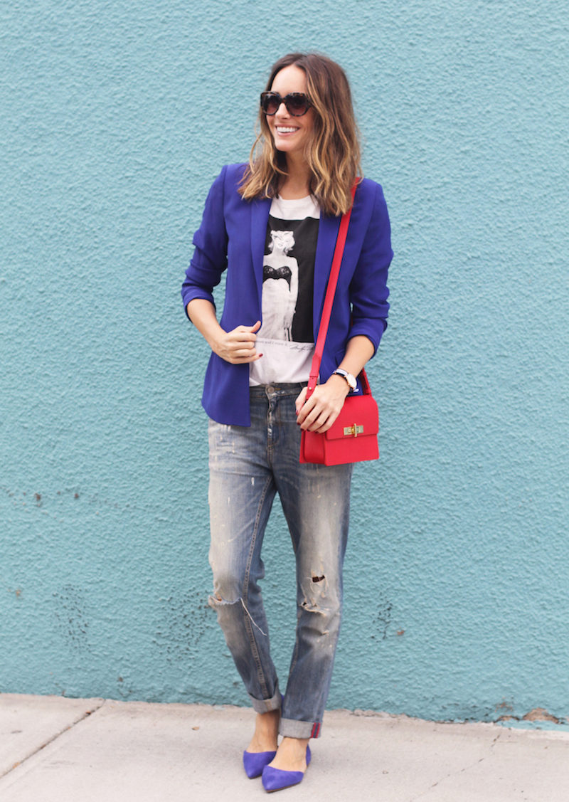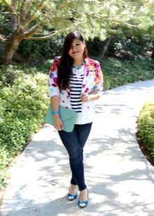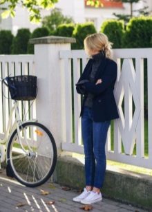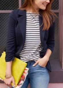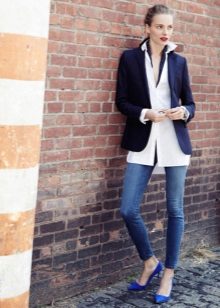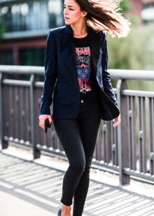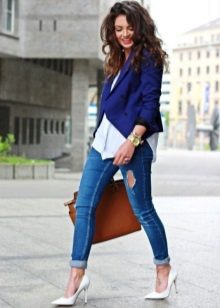 Blue jacket looks great with a shirt and pumps in a business image. Every day you can pick up torn jeans and a T-shirt with an interesting print. To look look complete, do not forget about a scarf or a scarf, a beautiful necklace, a small handbag on a long strap.