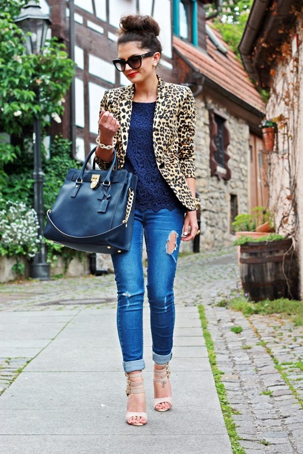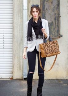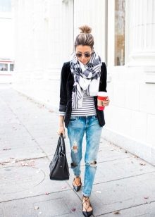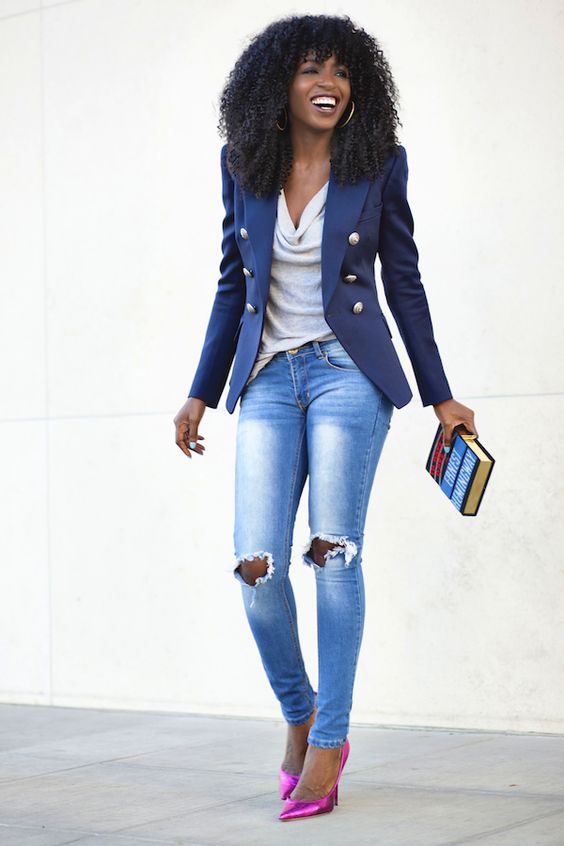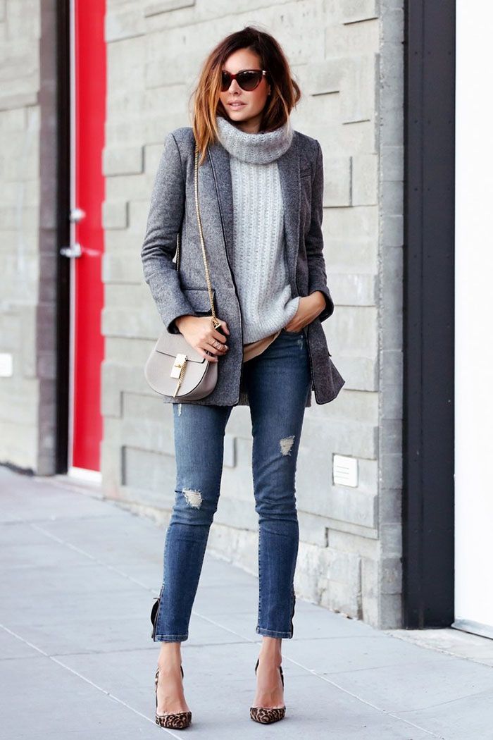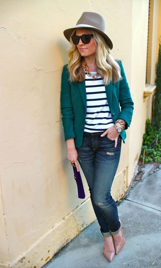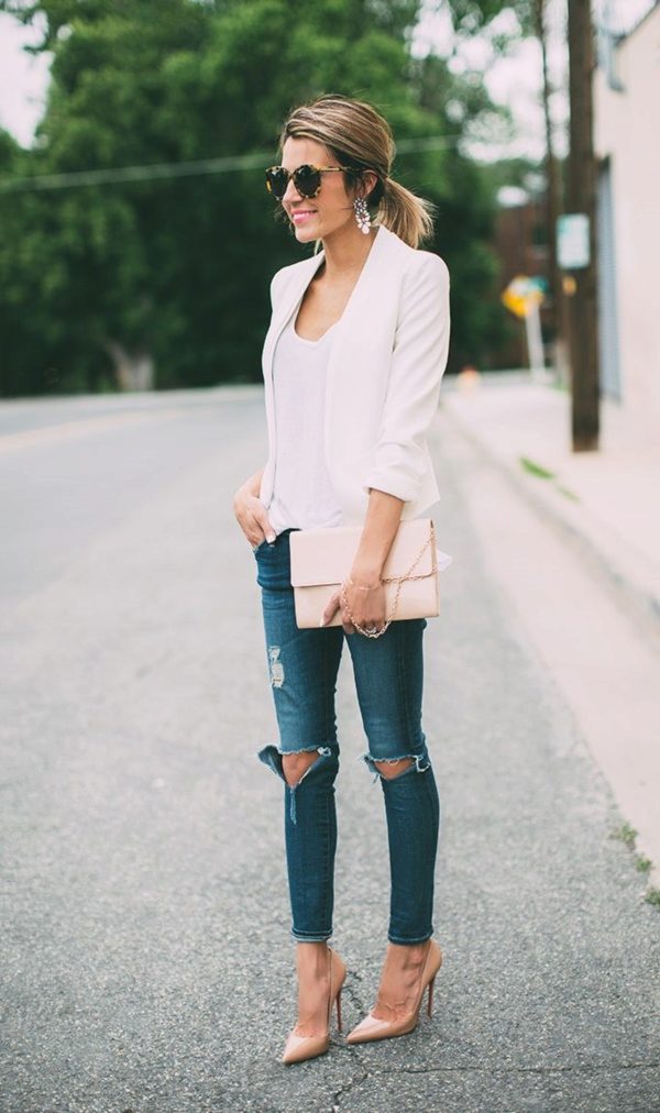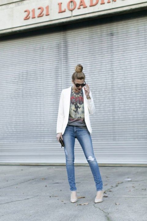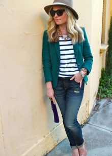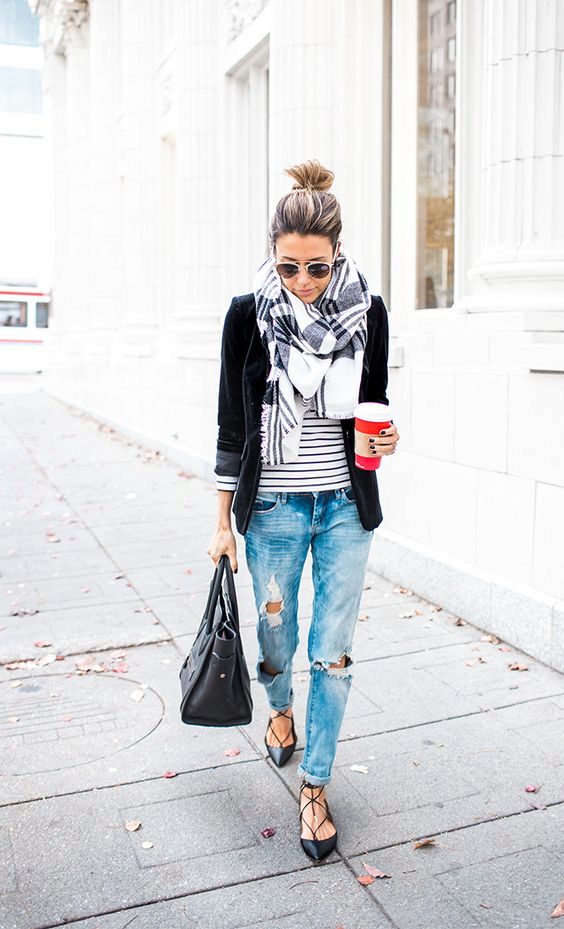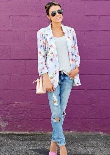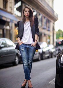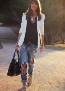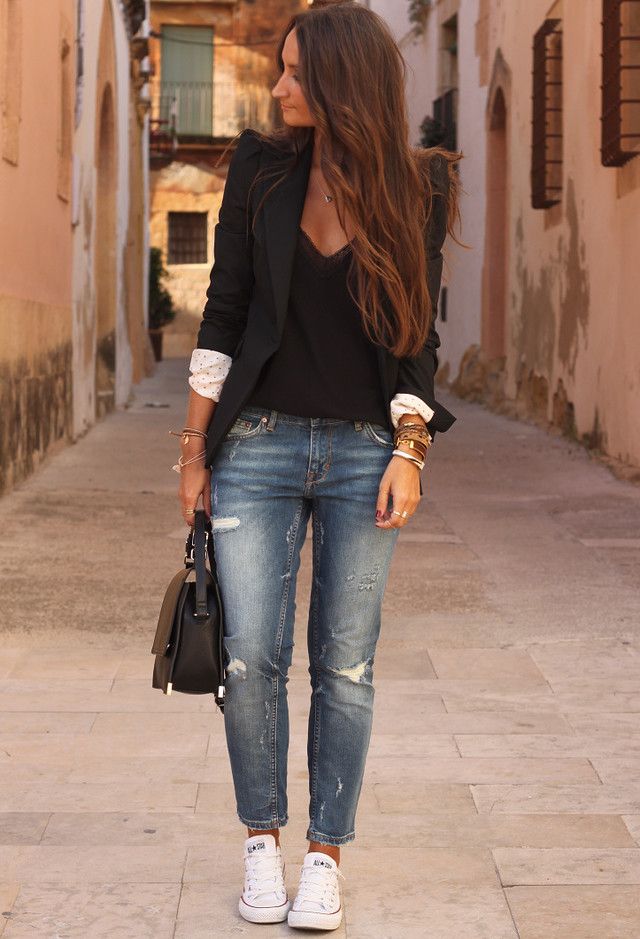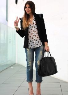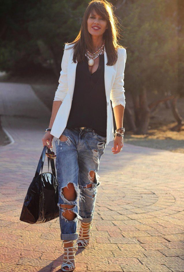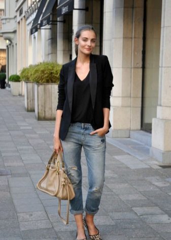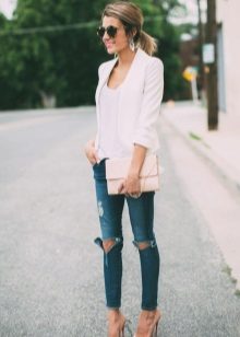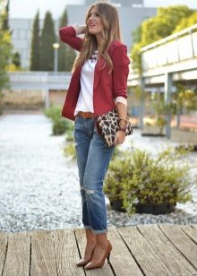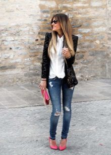 Do not be afraid to experiment, ripped, frayed, “worn” jeans will look great with a jacket. Also popular are models with patches, fringe, stripes. There are no restrictions on the choice of jeans!