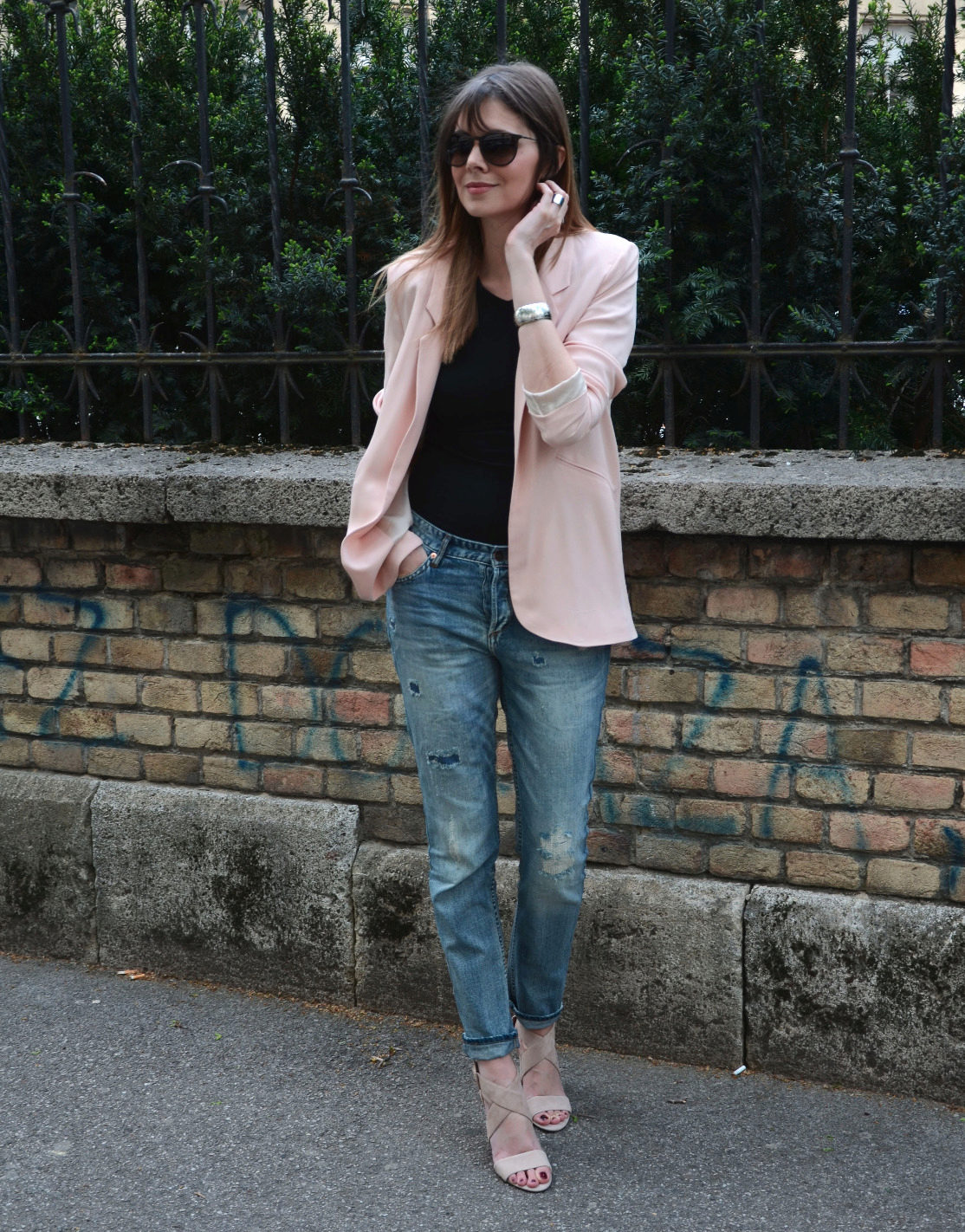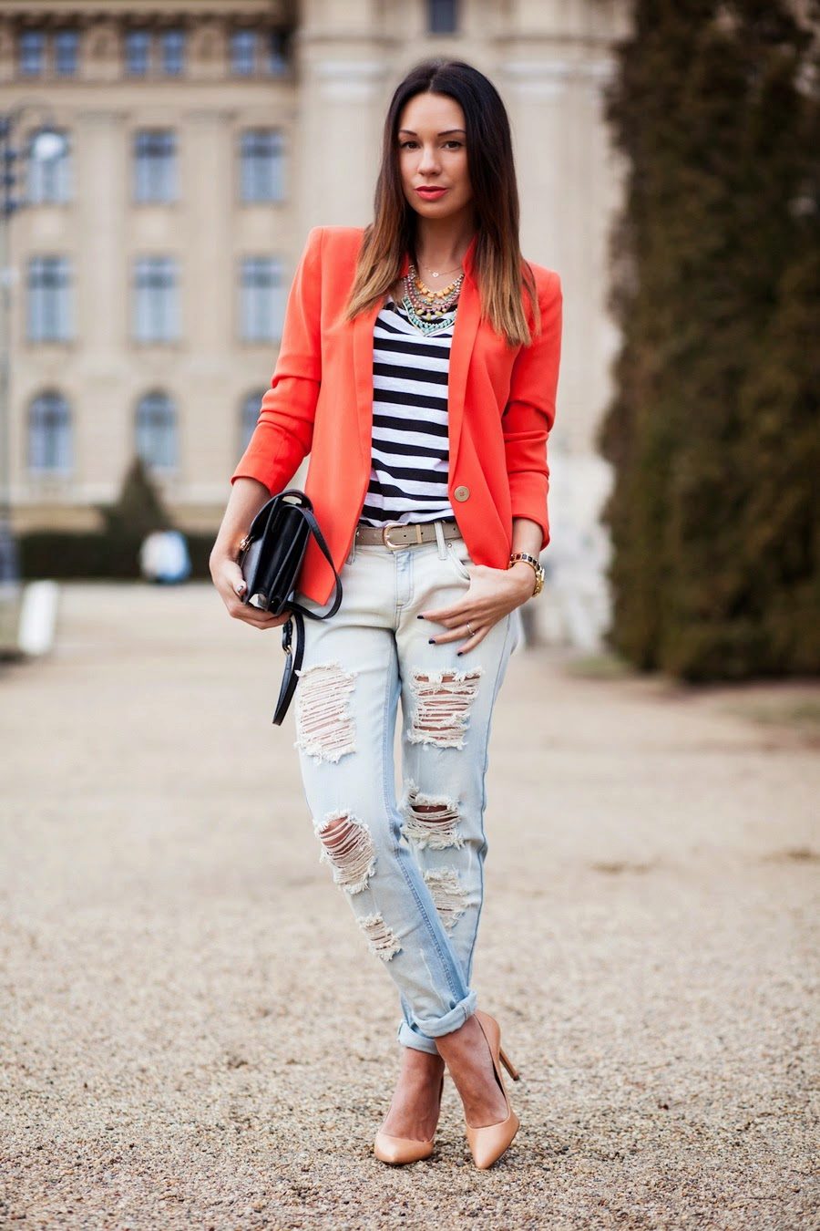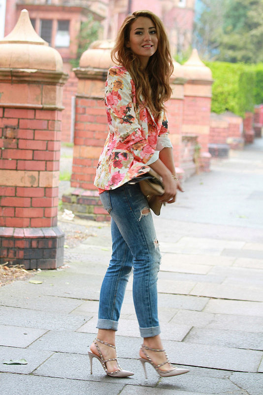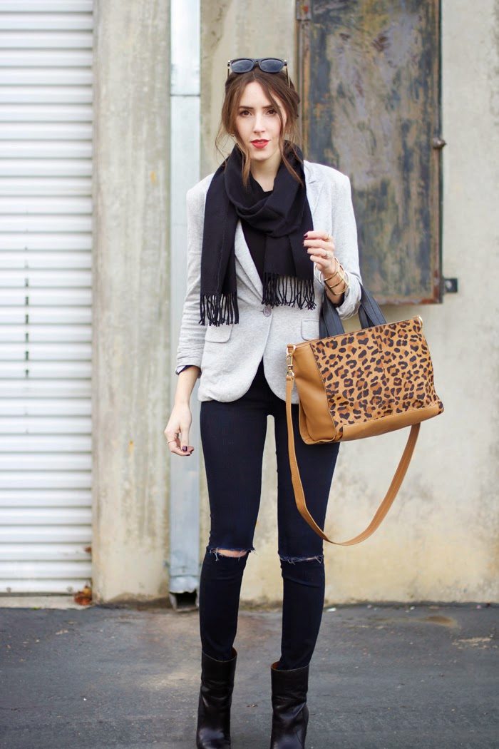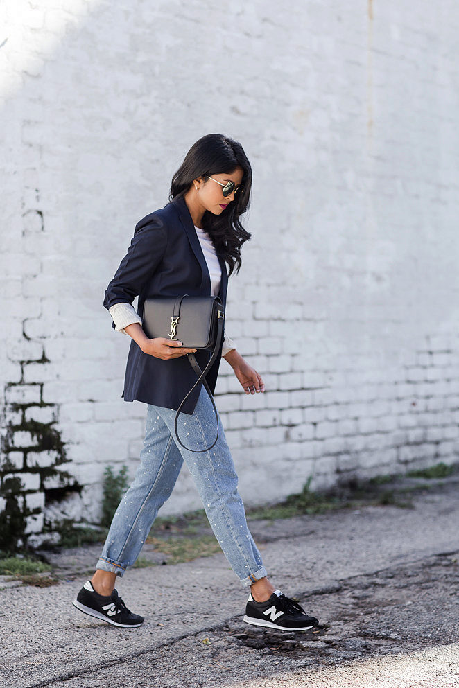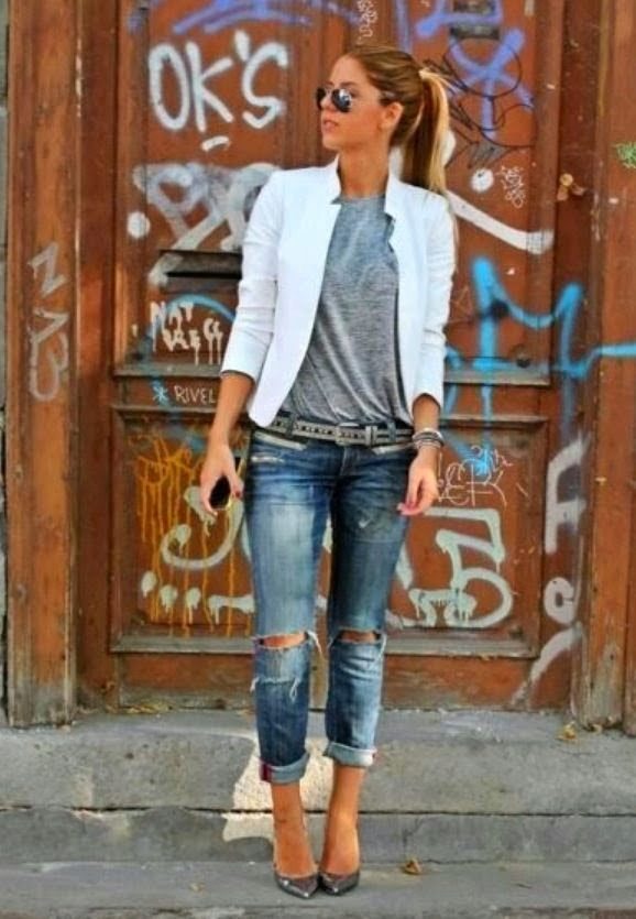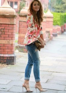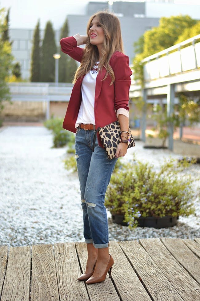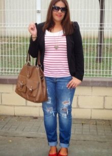 Do not be afraid to experiment, ripped, frayed, “worn” jeans will look great with a jacket. Also popular are models with patches, fringe, stripes. There are no restrictions on the choice of jeans!