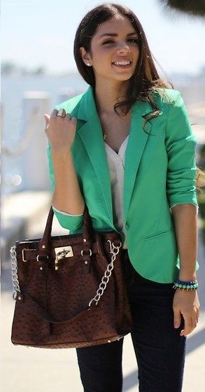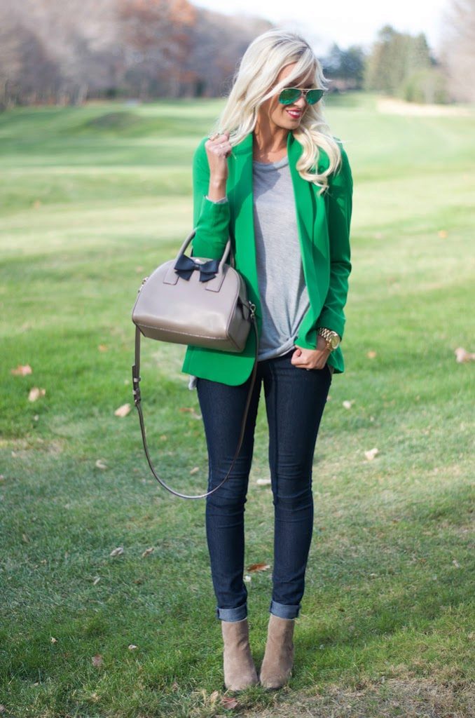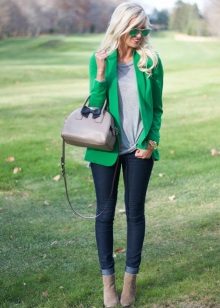 A green jacket, depending on the chosen material and shade, will help create both a classic business look and a summer one - relaxed and fresh. Combine it with simple basic things - light shirts, T-shirts, vests. Jeans is better to choose a classic blue.