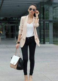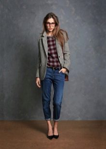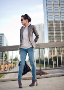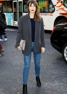 You may be surprised, but the most appropriate choice of a jacket under jeans can be considered a classic model. The traditional style of the jacket is combined with any jeans, the model of which you can choose at your discretion. Of course, a win-win option - jeans are narrowed to the bottom, which is suitable for almost any type of figure.